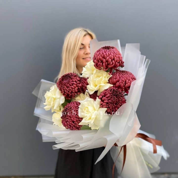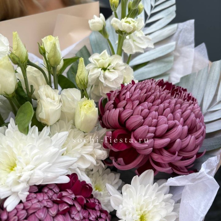 Хризантемы с маттиолой розами эустомой Чика