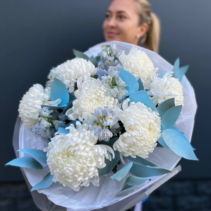 Букет хризантем Бигуди и дельфиниума