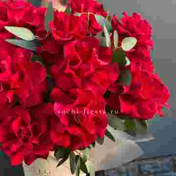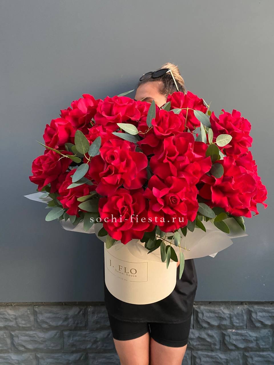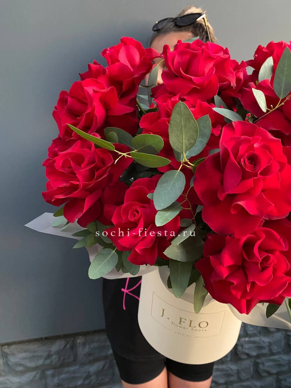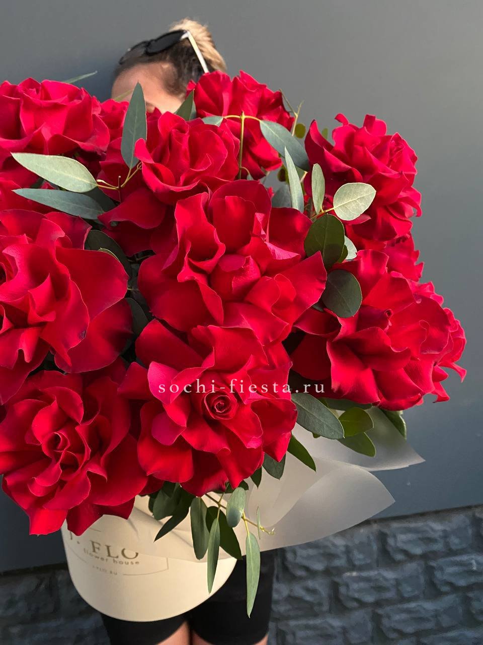 Состав: вывернутые  розы - 25 шт., эвкалипт, коробка, оформление