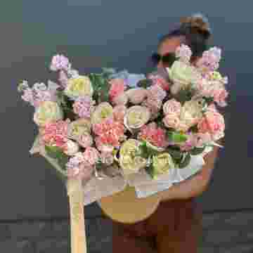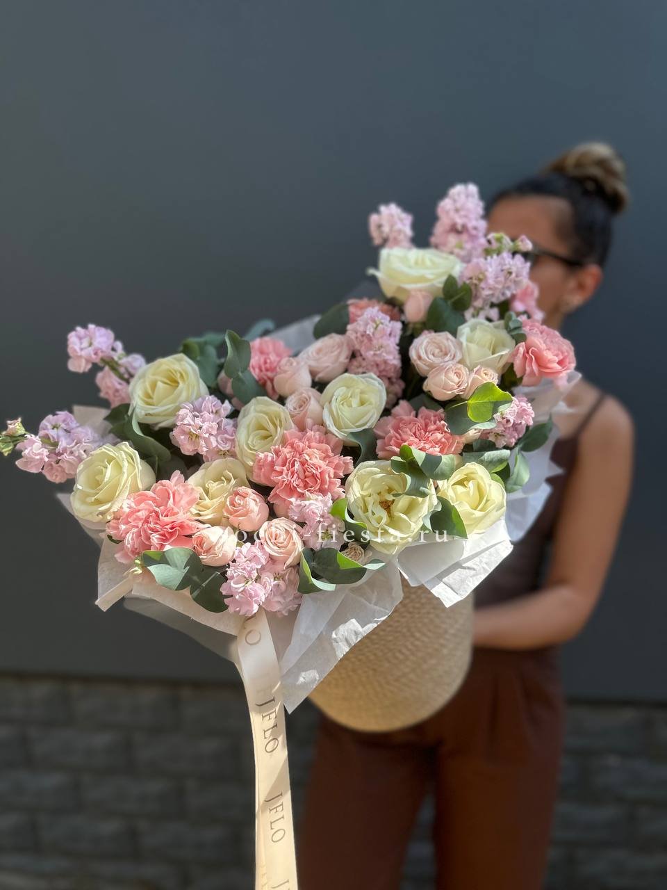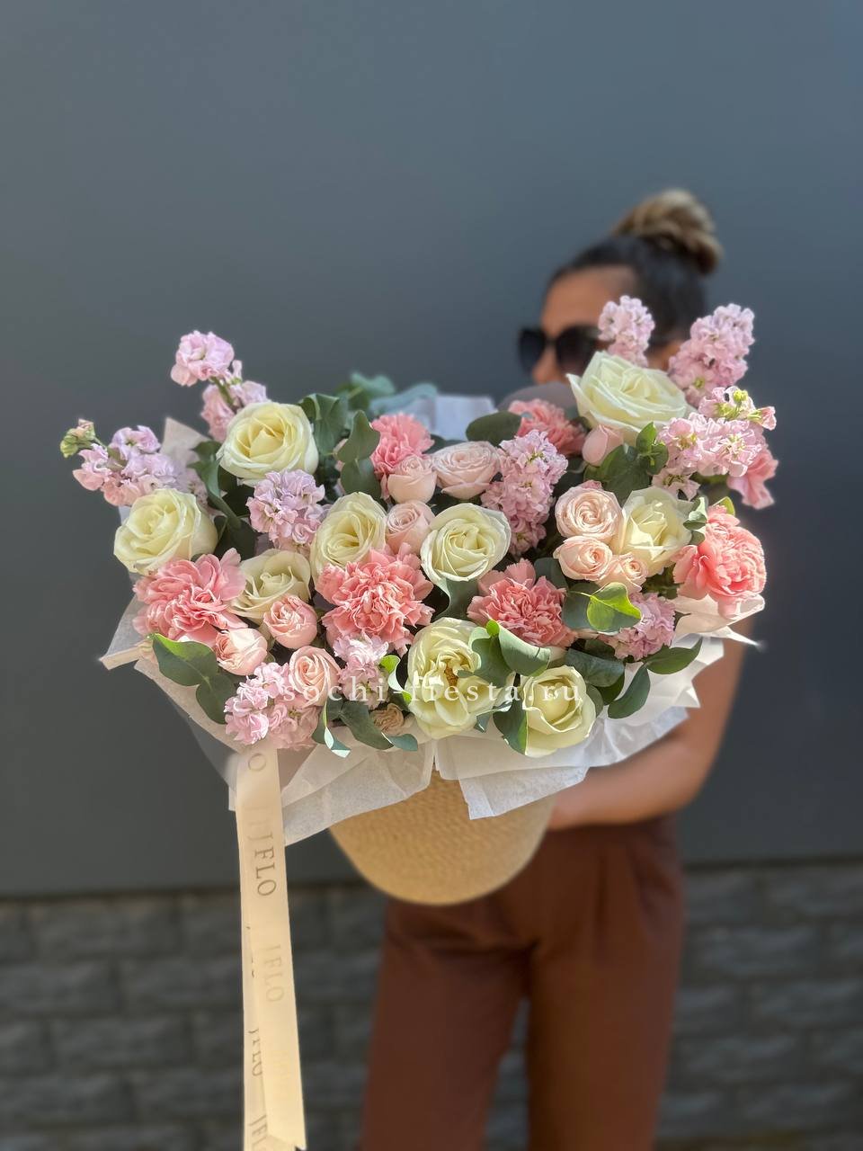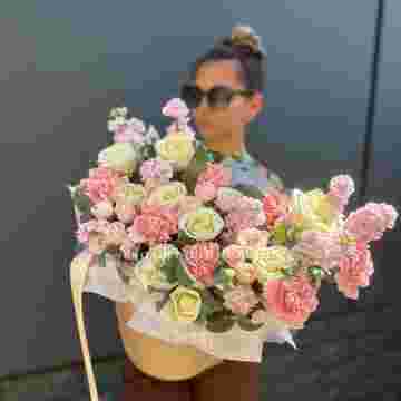 Джутовый бокс в составе которого: белые розы, маттиола, диантусы, кустовые розы,эвкалипт.