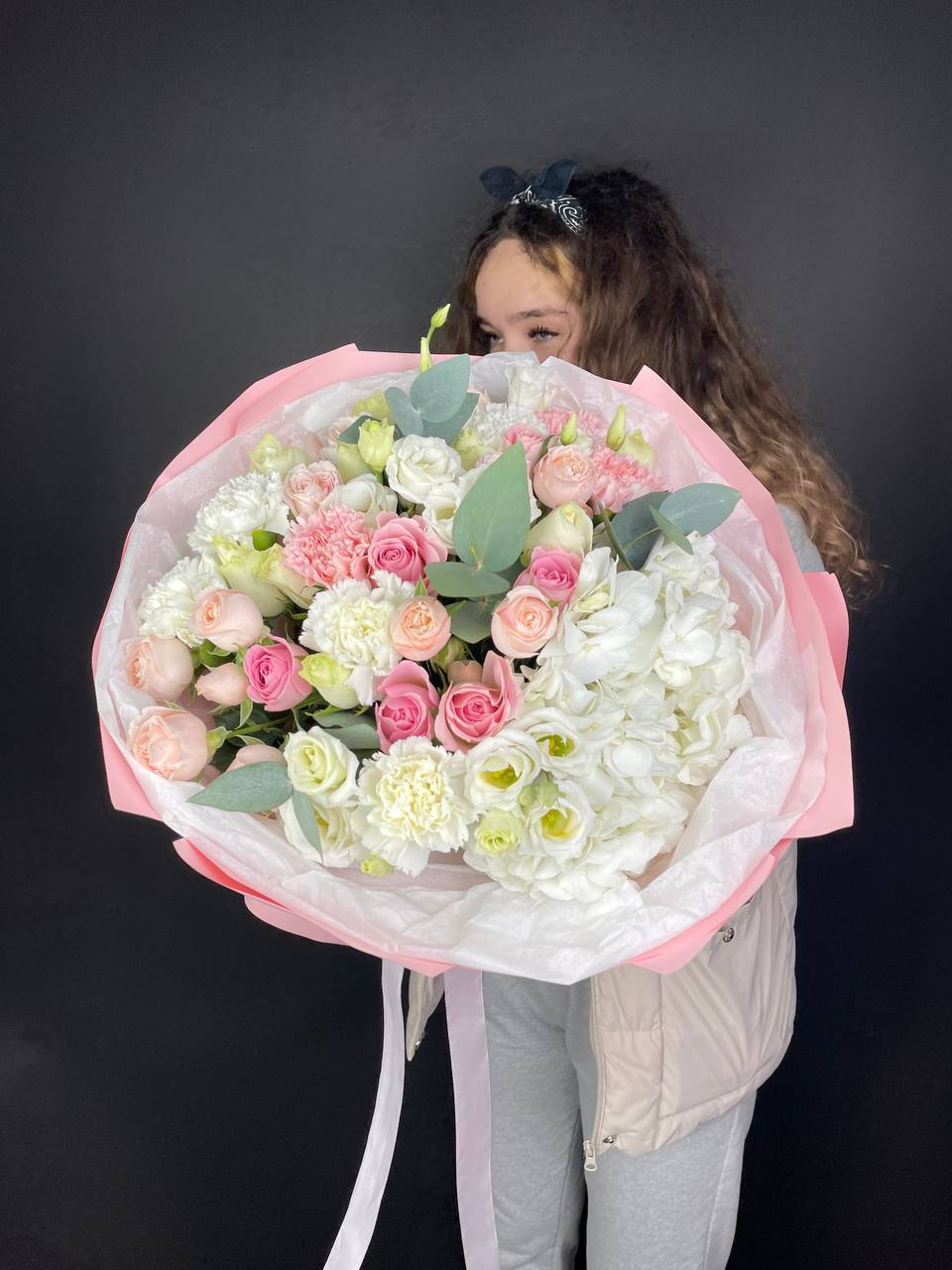 гортензия, белые розы, гипсофилы (или мимоза), эустомы, герберы, хлопок, лента и дизайнерская пленка.