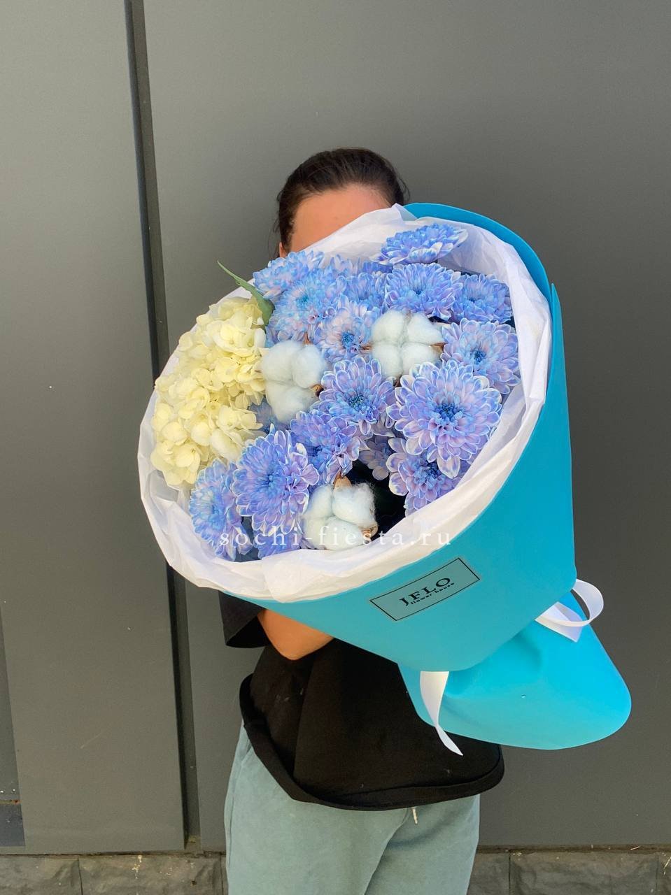 Состав: хризантема кустовая, гортензия, хлопок в оформлении.