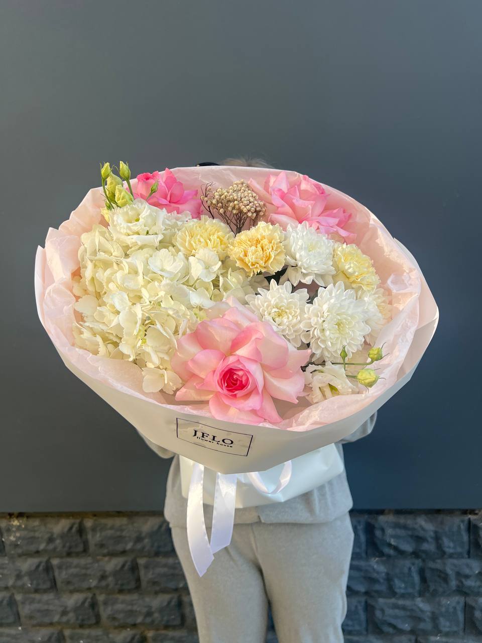 гортензия, вывернутые розы, лимониум(или аналог в несезон), лента, авторская упаковка.