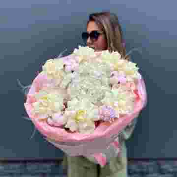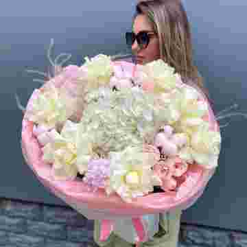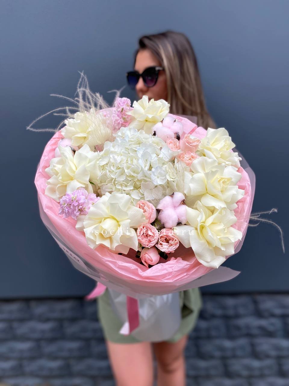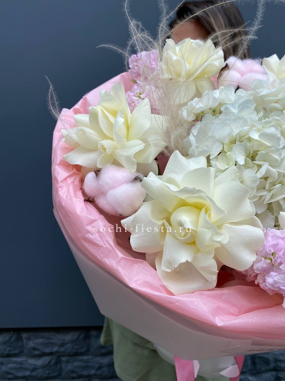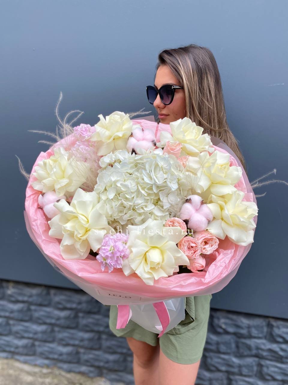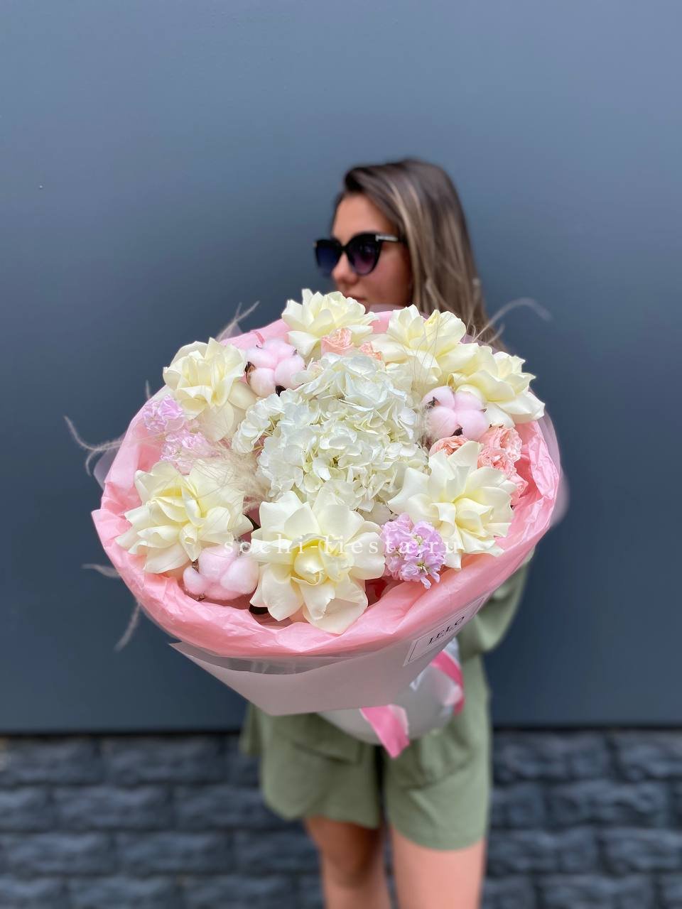 Состав: гортензия, хлопок, бомбастик, белая роза, маттиола- может меняться от сезона, ковыль, упаковка