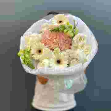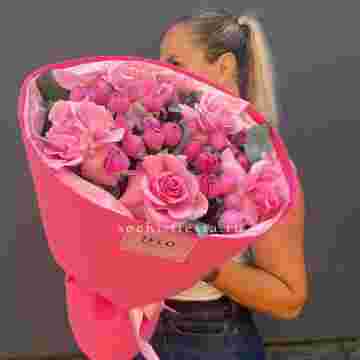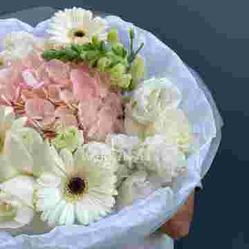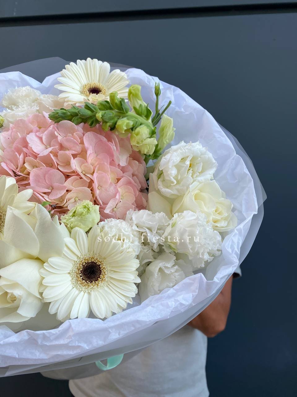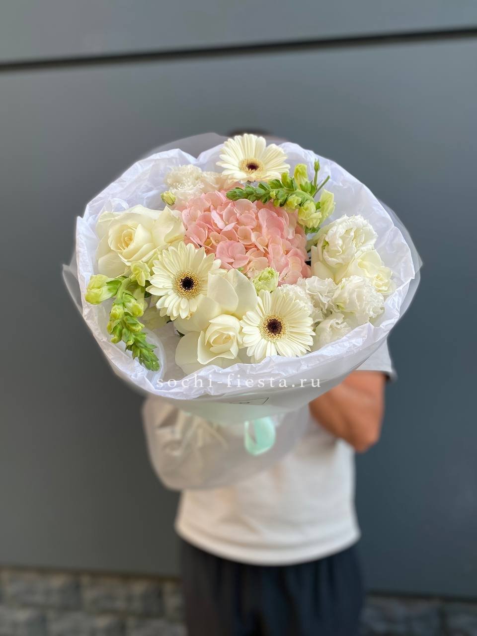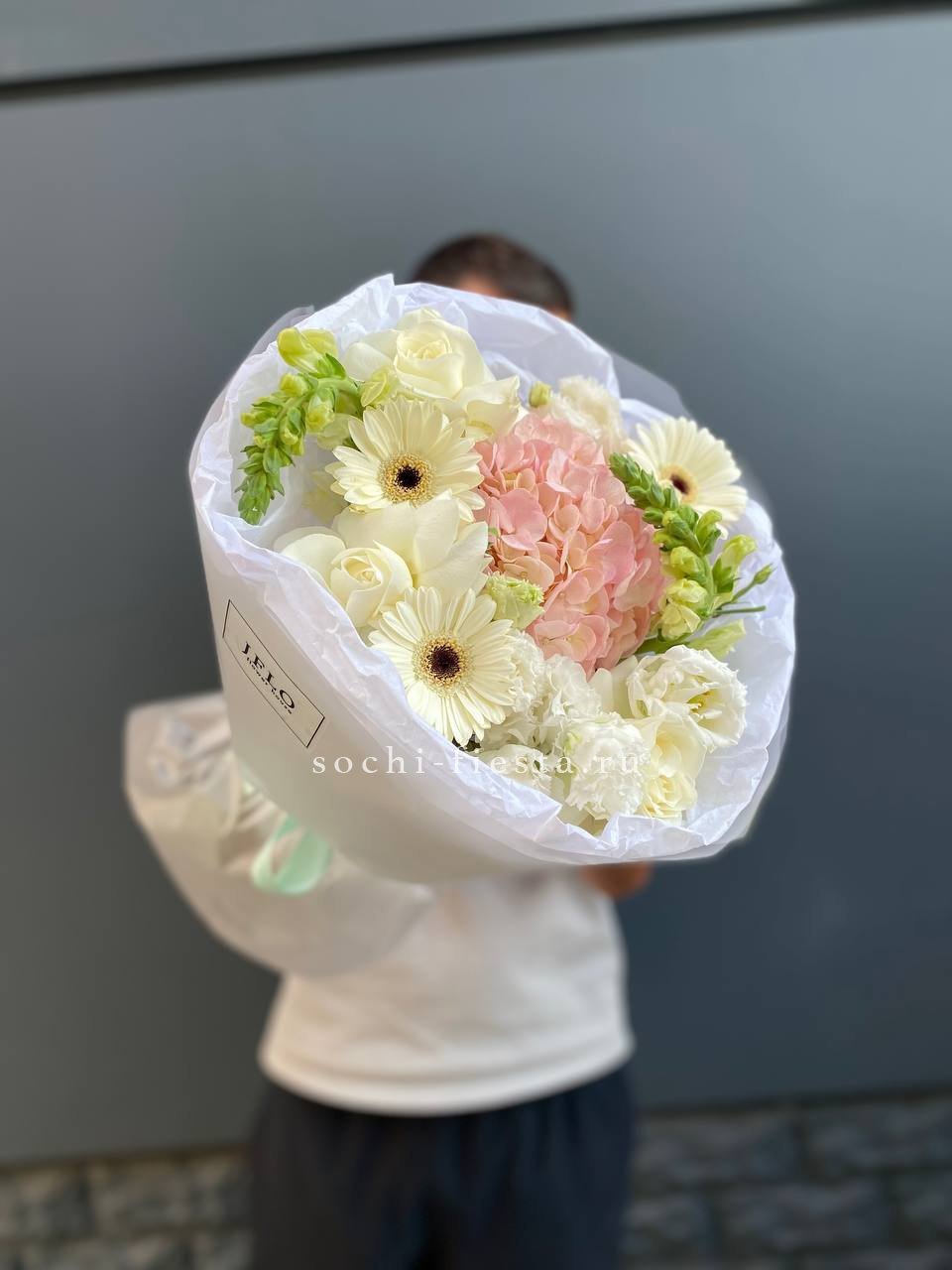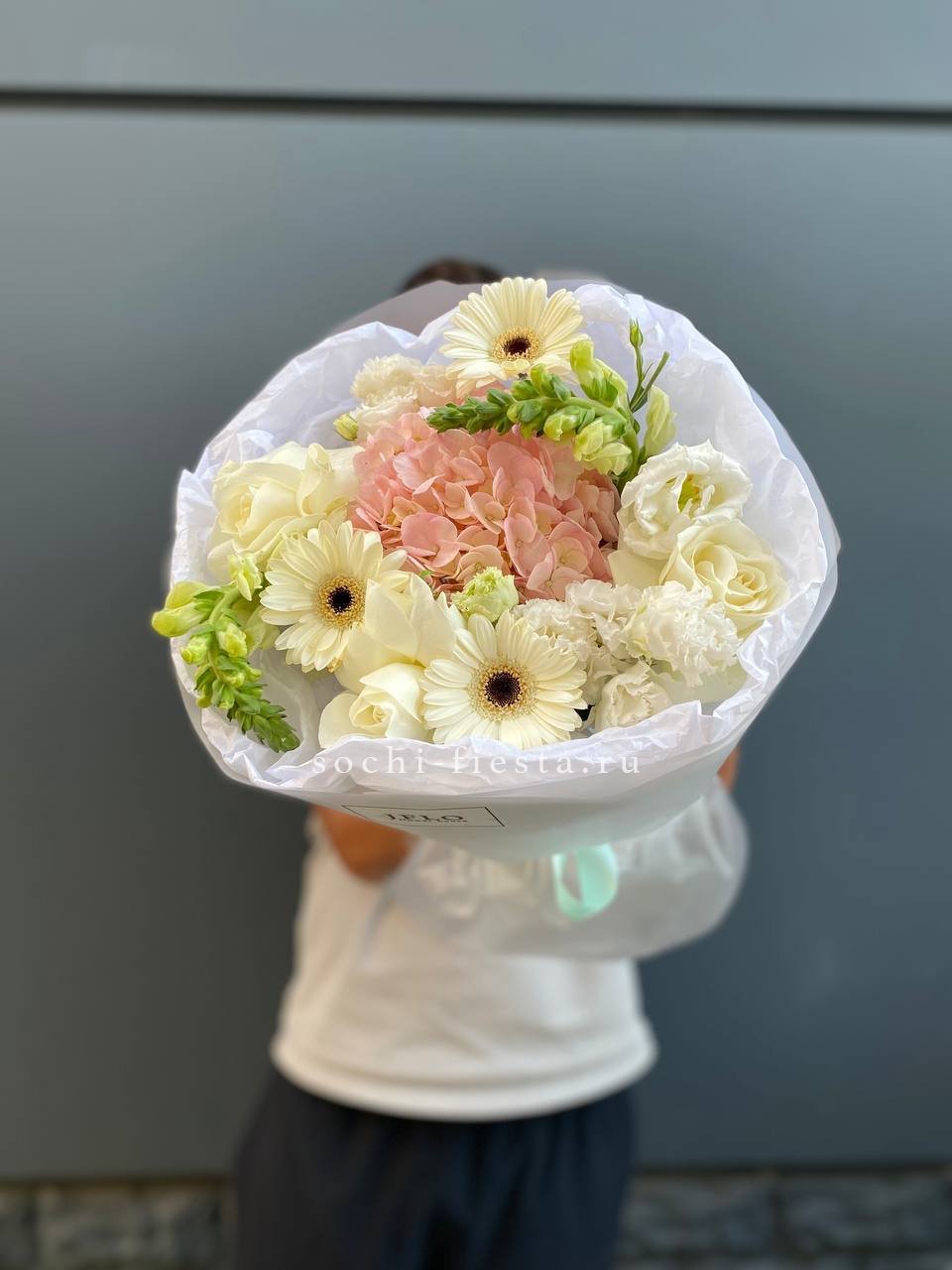 Состав: гербера, роза, антиринум, гортензия, эустома, упаковка