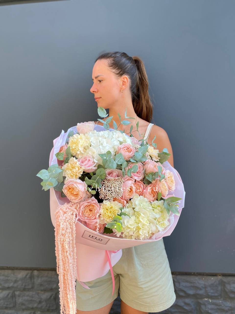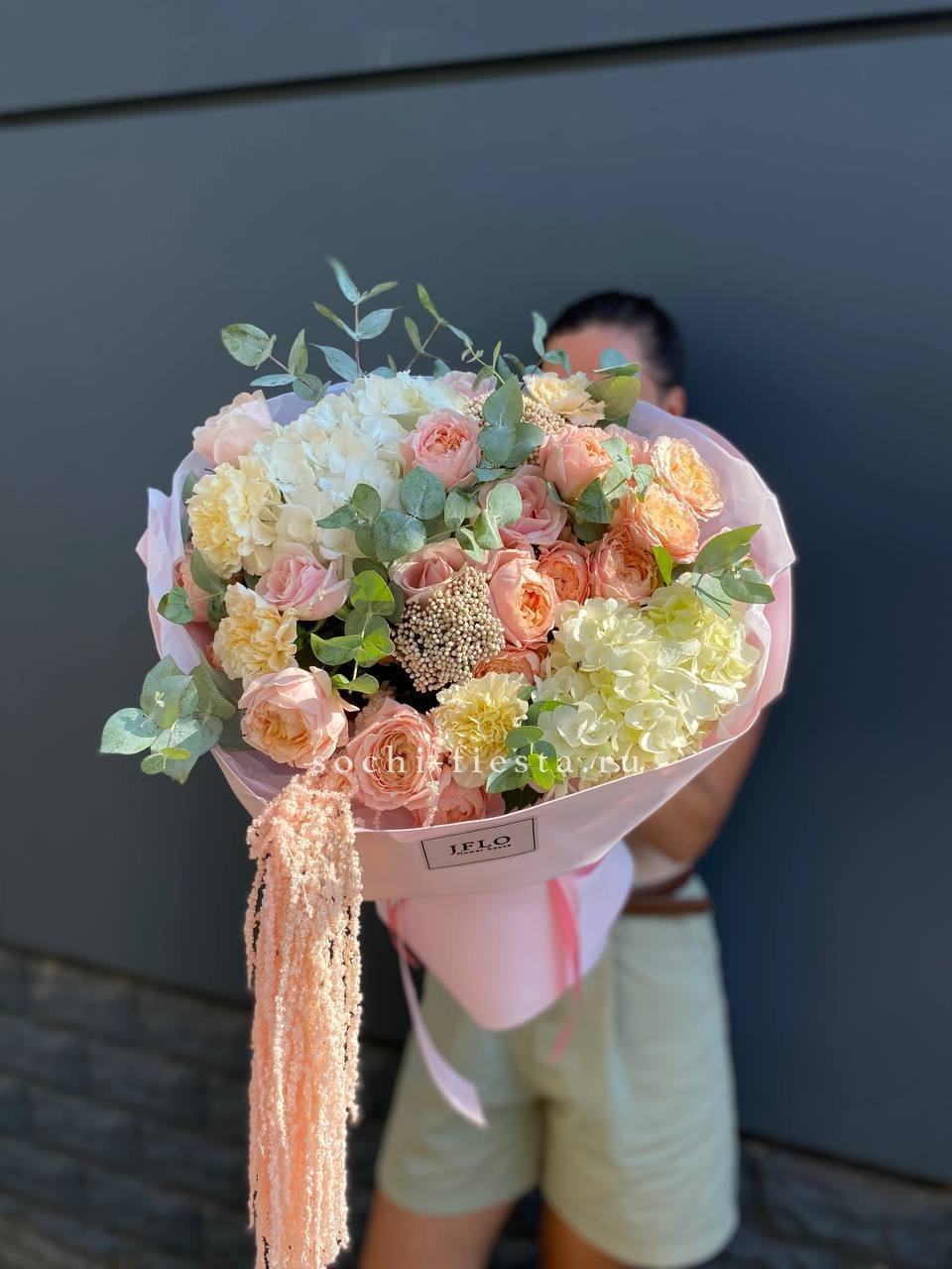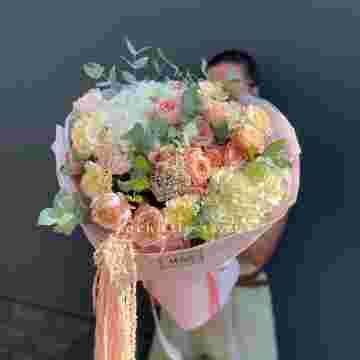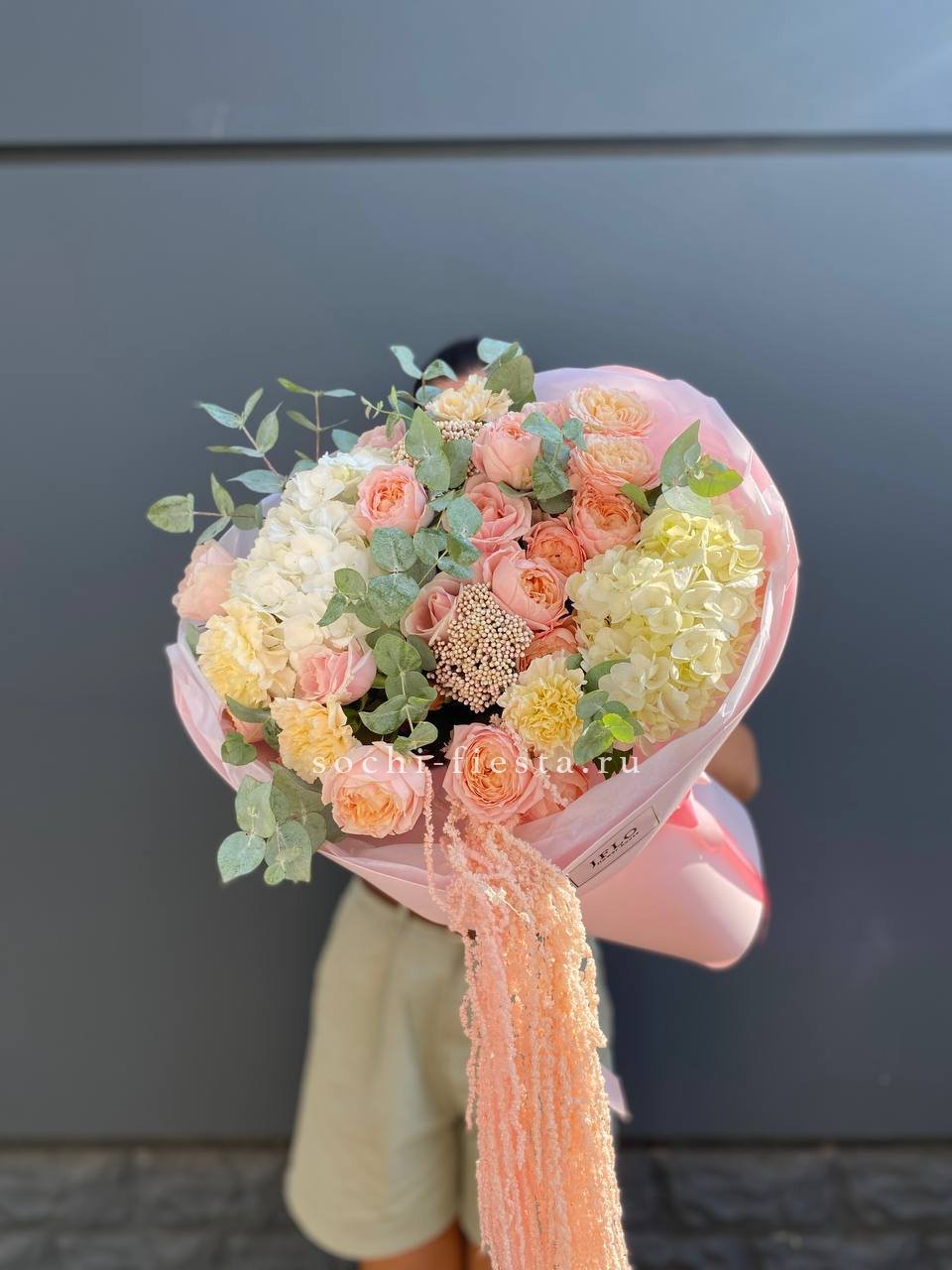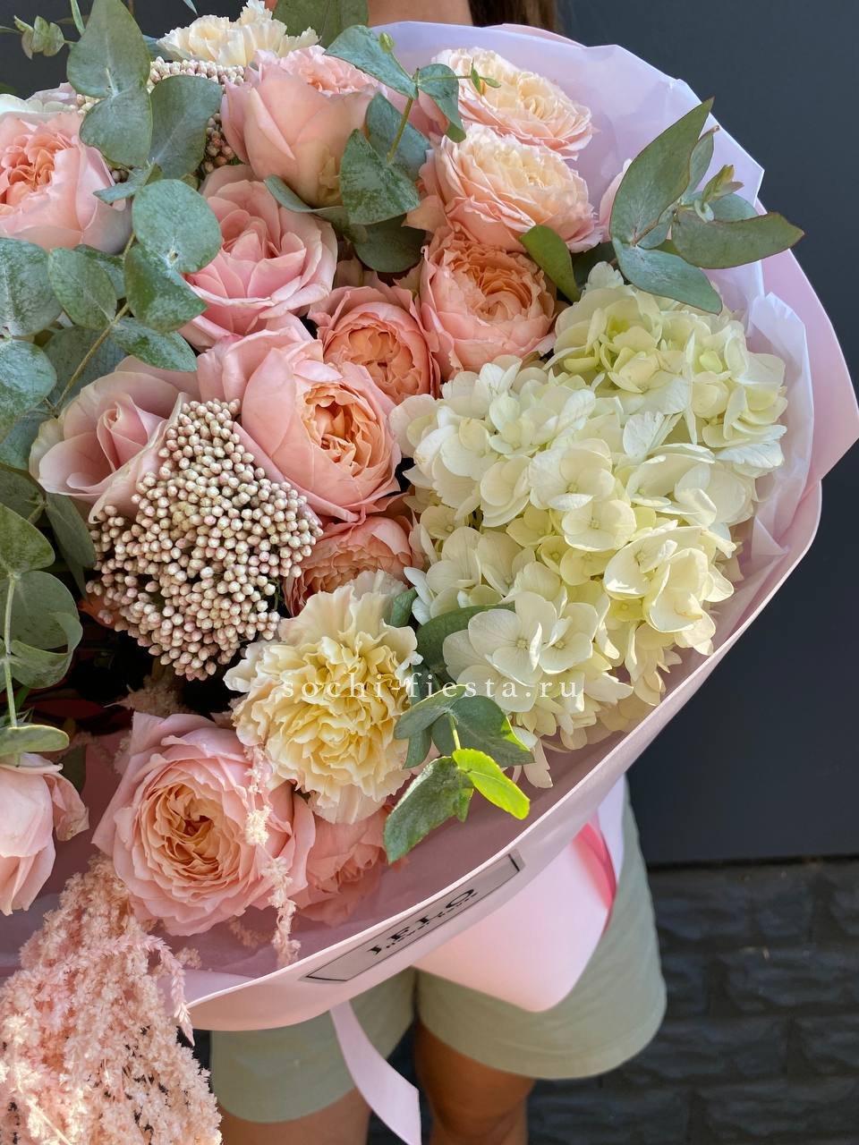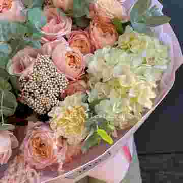 Состав: джульетта, озатамус, диантус, гортензия, розовая роза, амарант, оформление