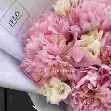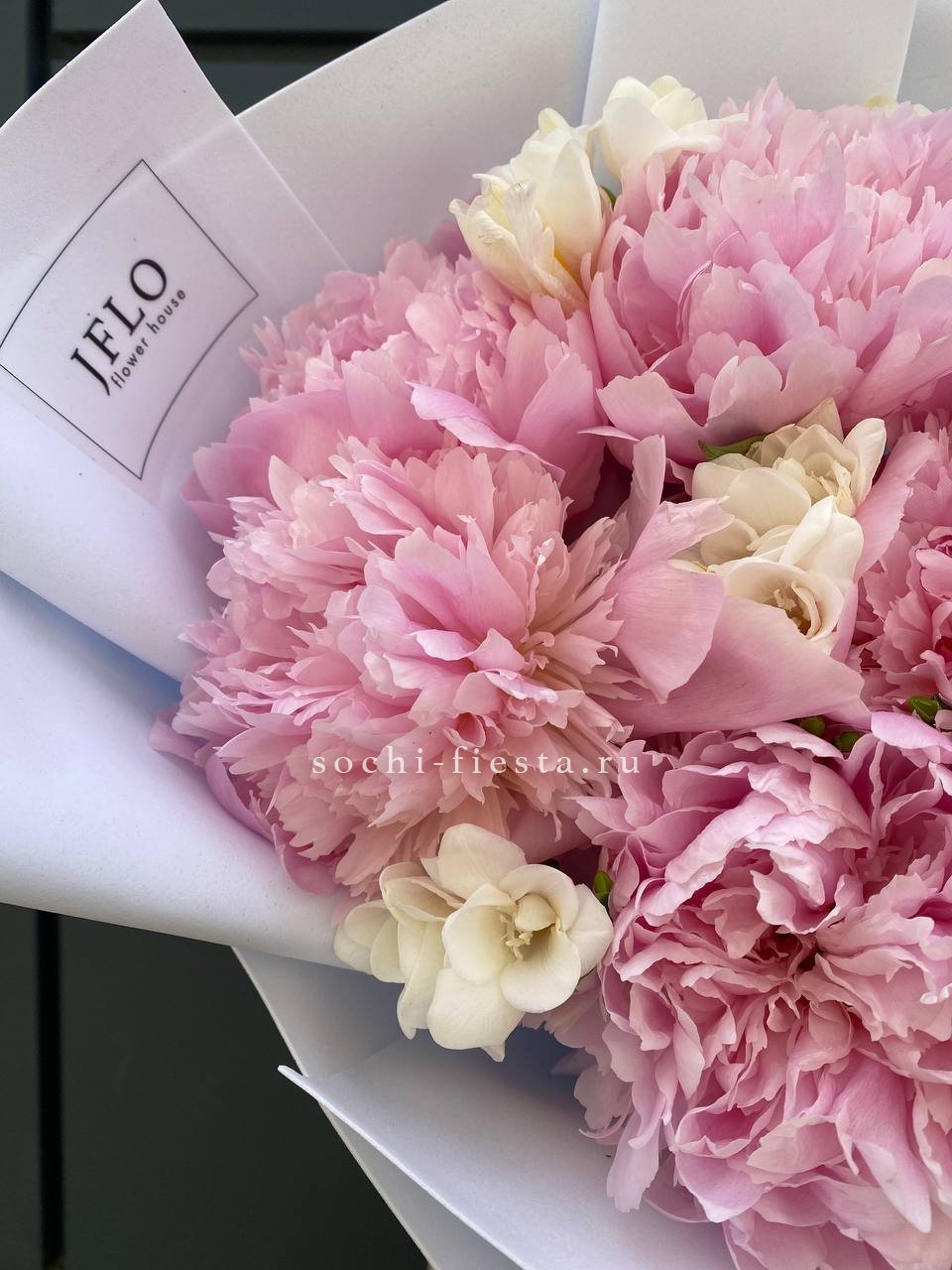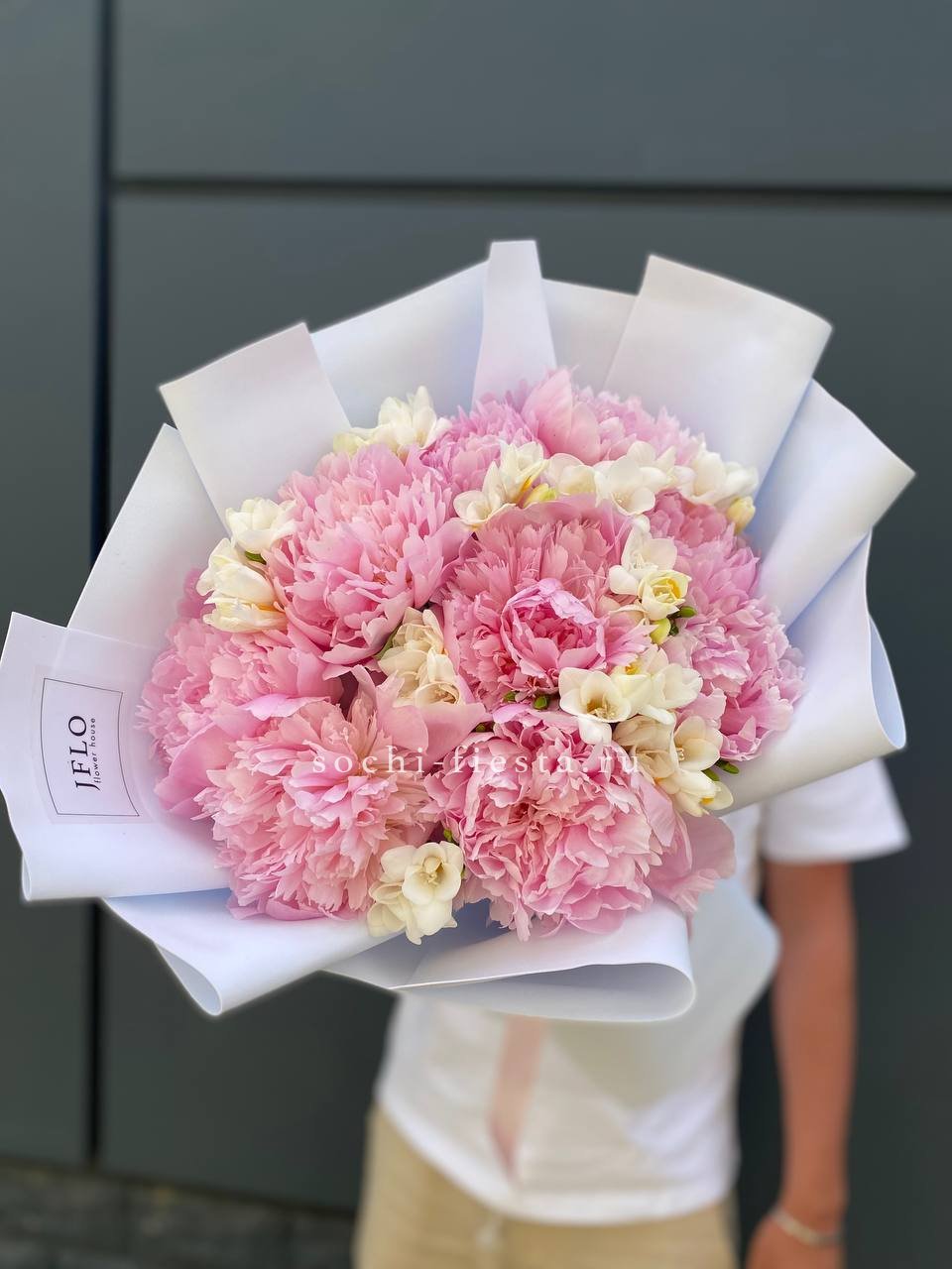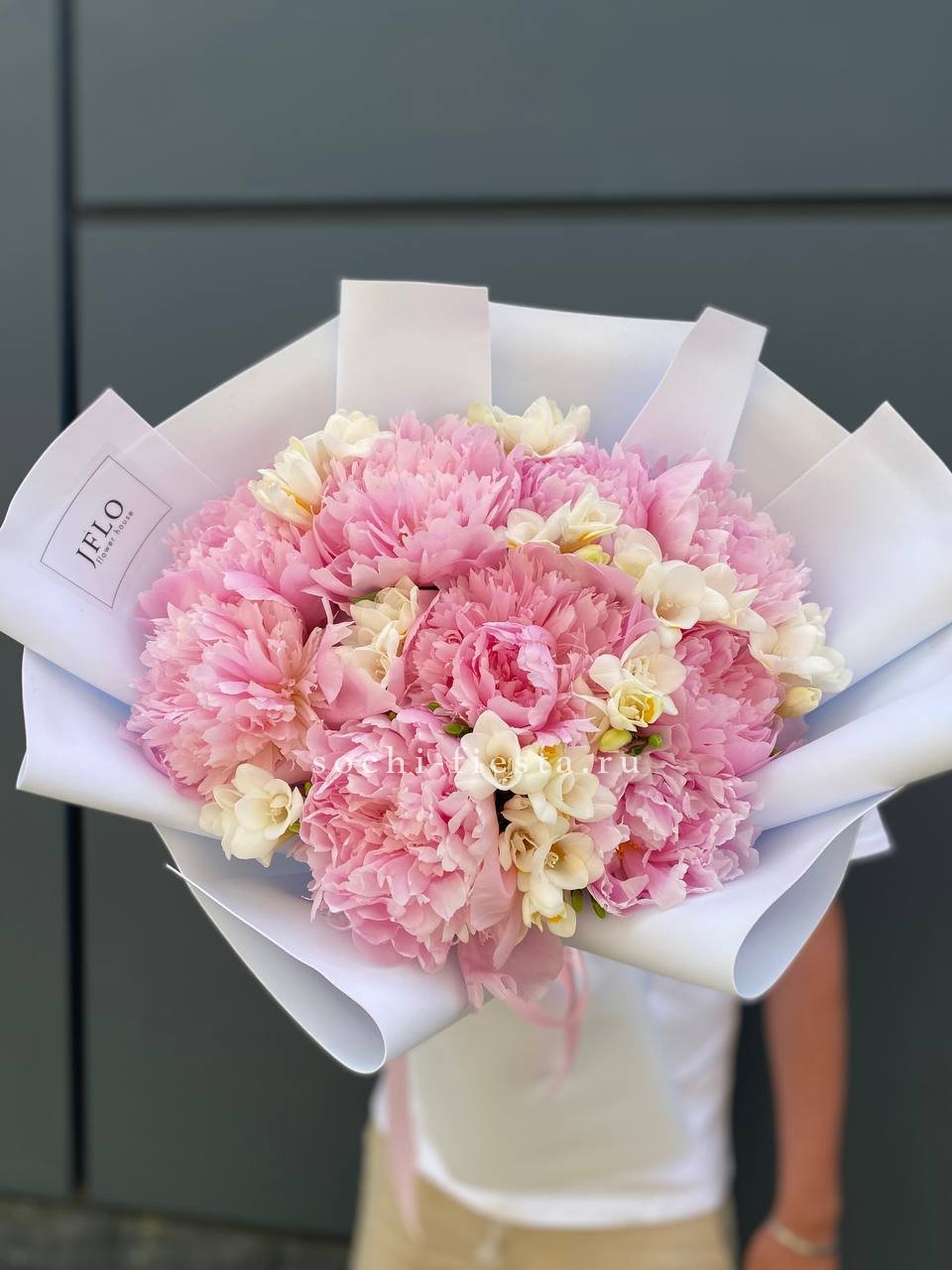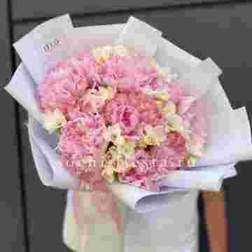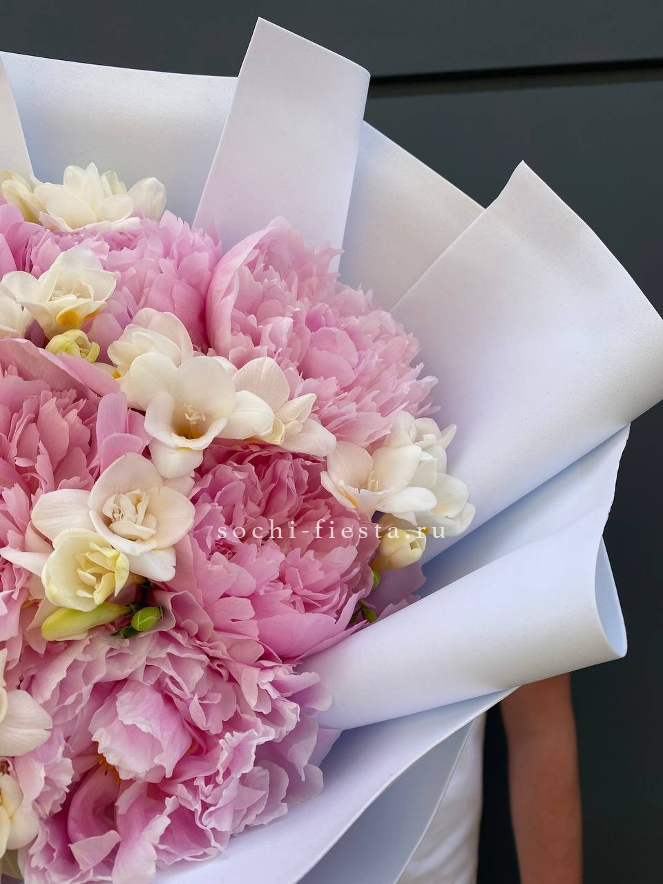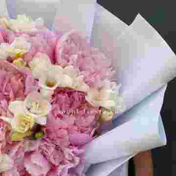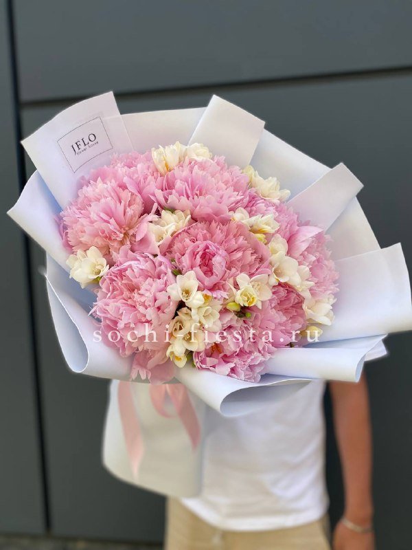 Состав: пионы, фрезии, пленка, лента.