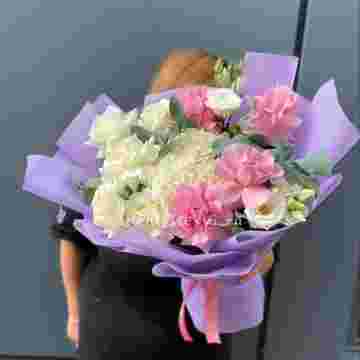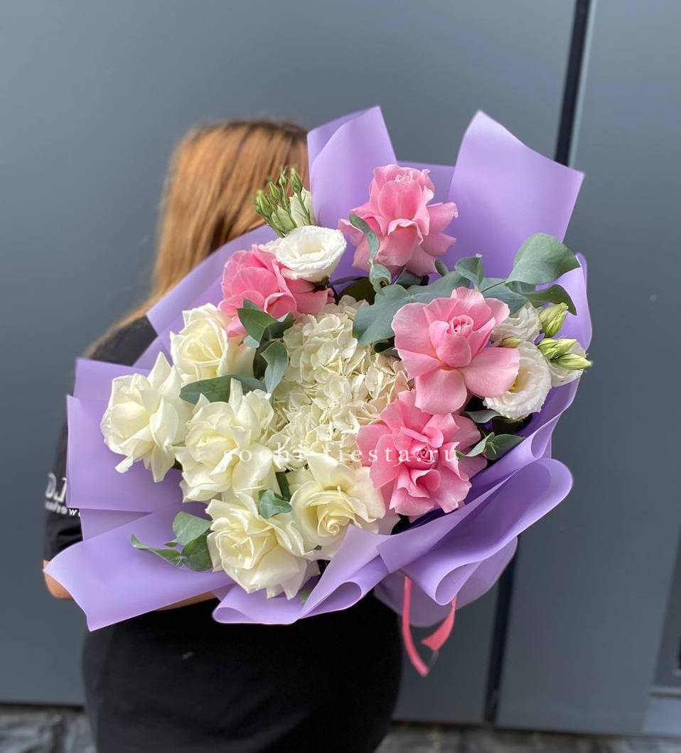 Состав: гортензия французские (вывернутые) розы, лента, дизайнерская пленка, тишью