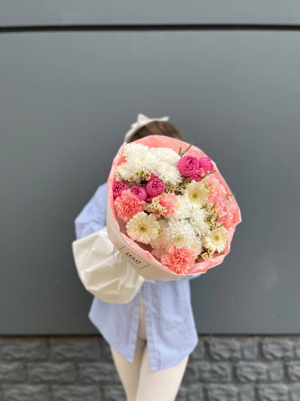 гортензия, хризантема, хамелациум, гербера, мисти баблс, диантус, пленка.