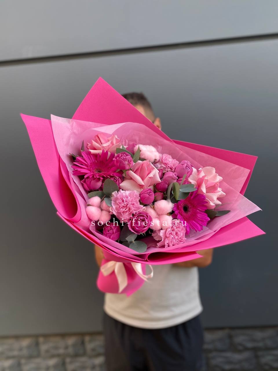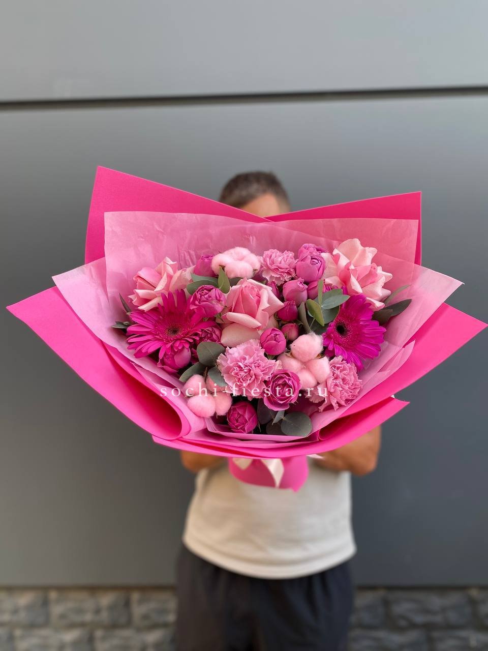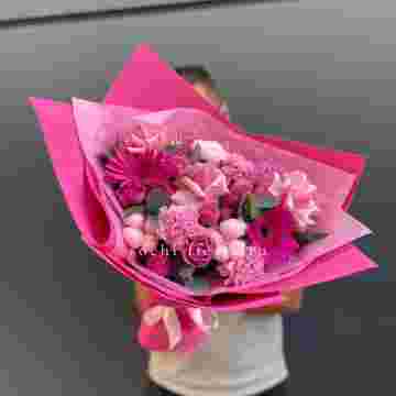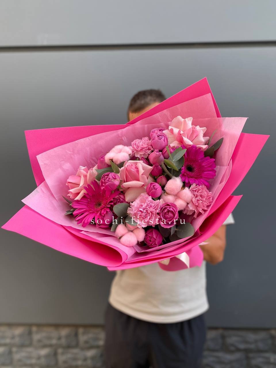 Состав: мисти баблс, розы, гербера, диантус, хлопок, упаковка