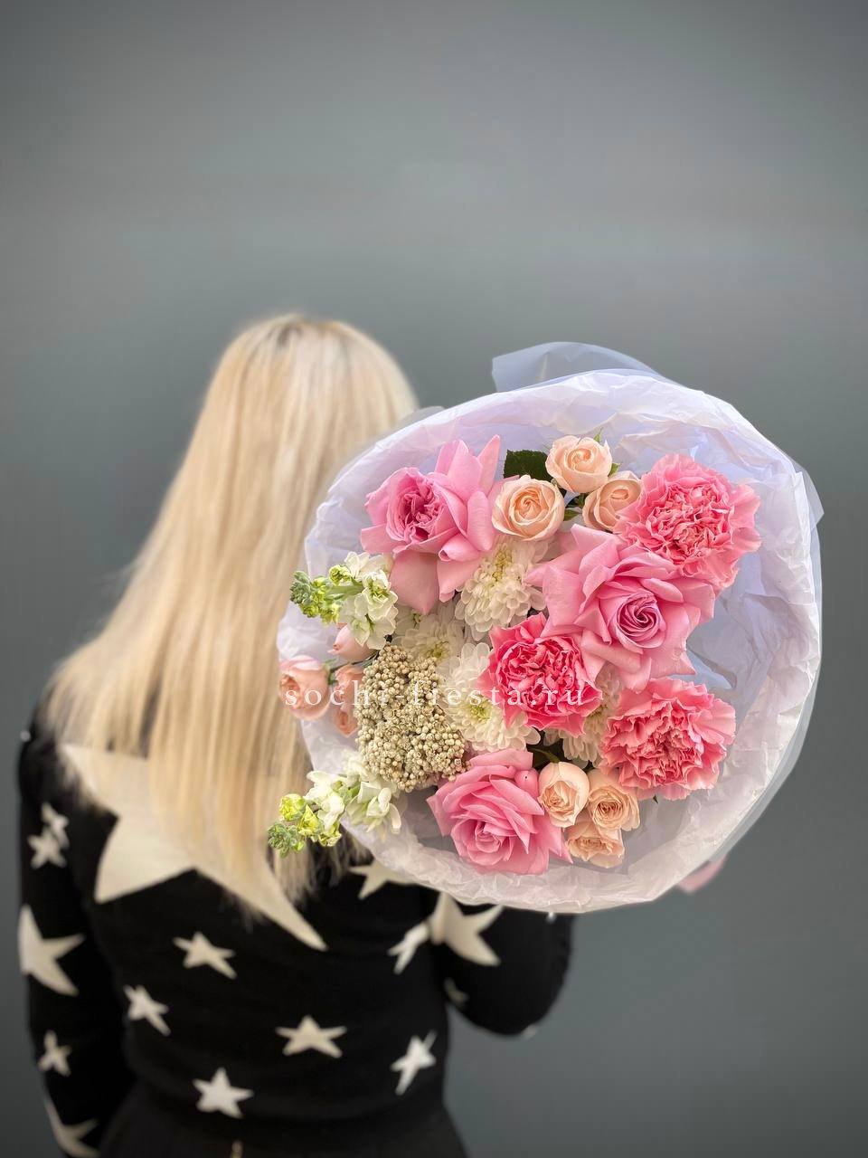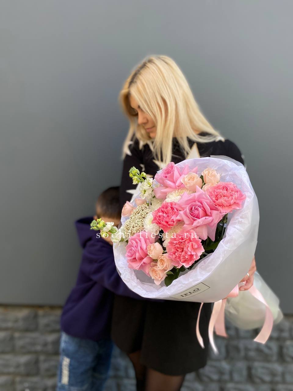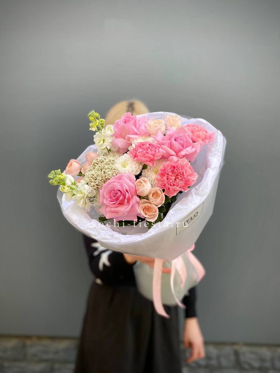 Состав: букет из нежных стойких цветов диантусов, роз, хризантем, маттиолы, озатамуса, бомбастика