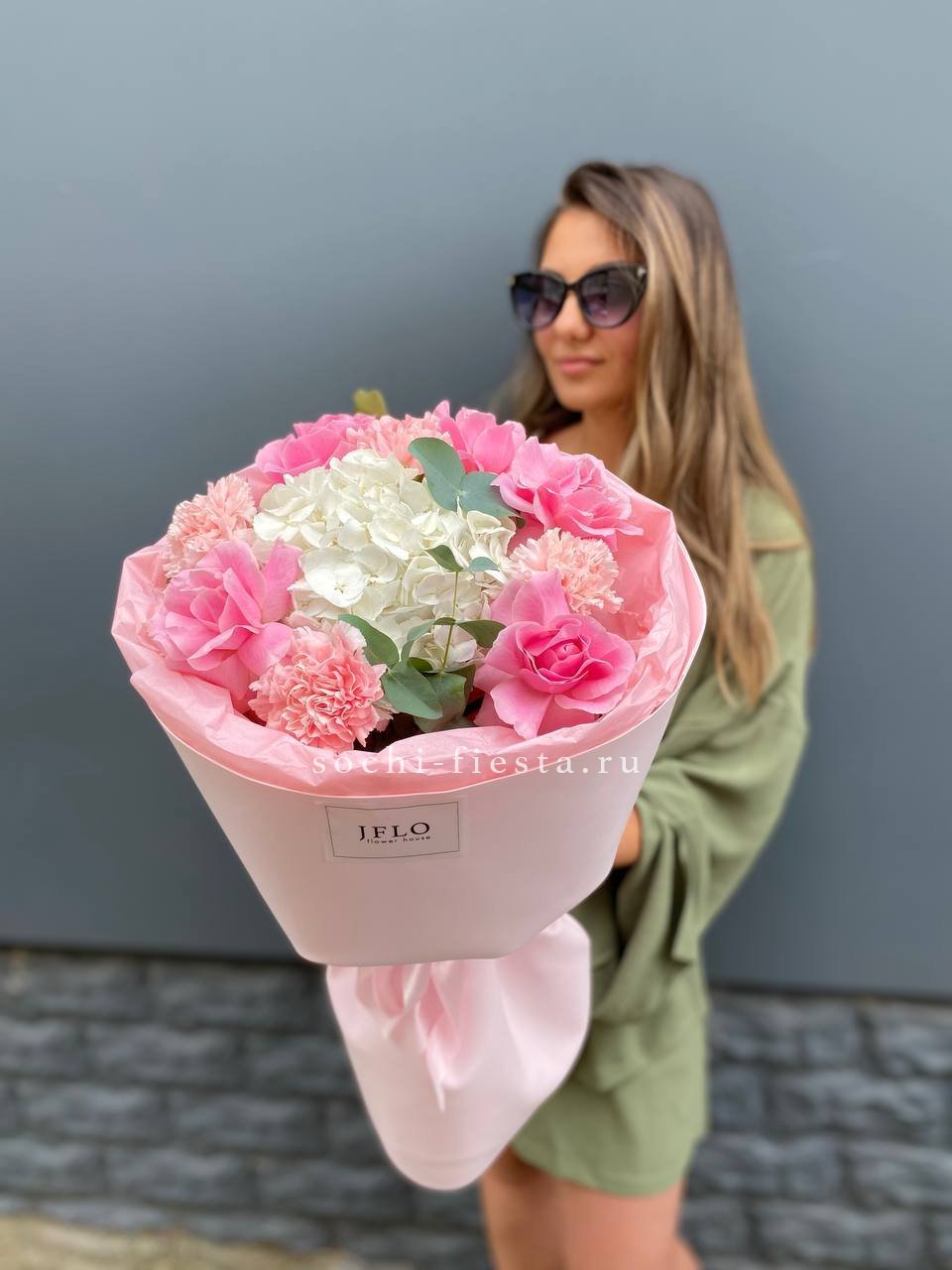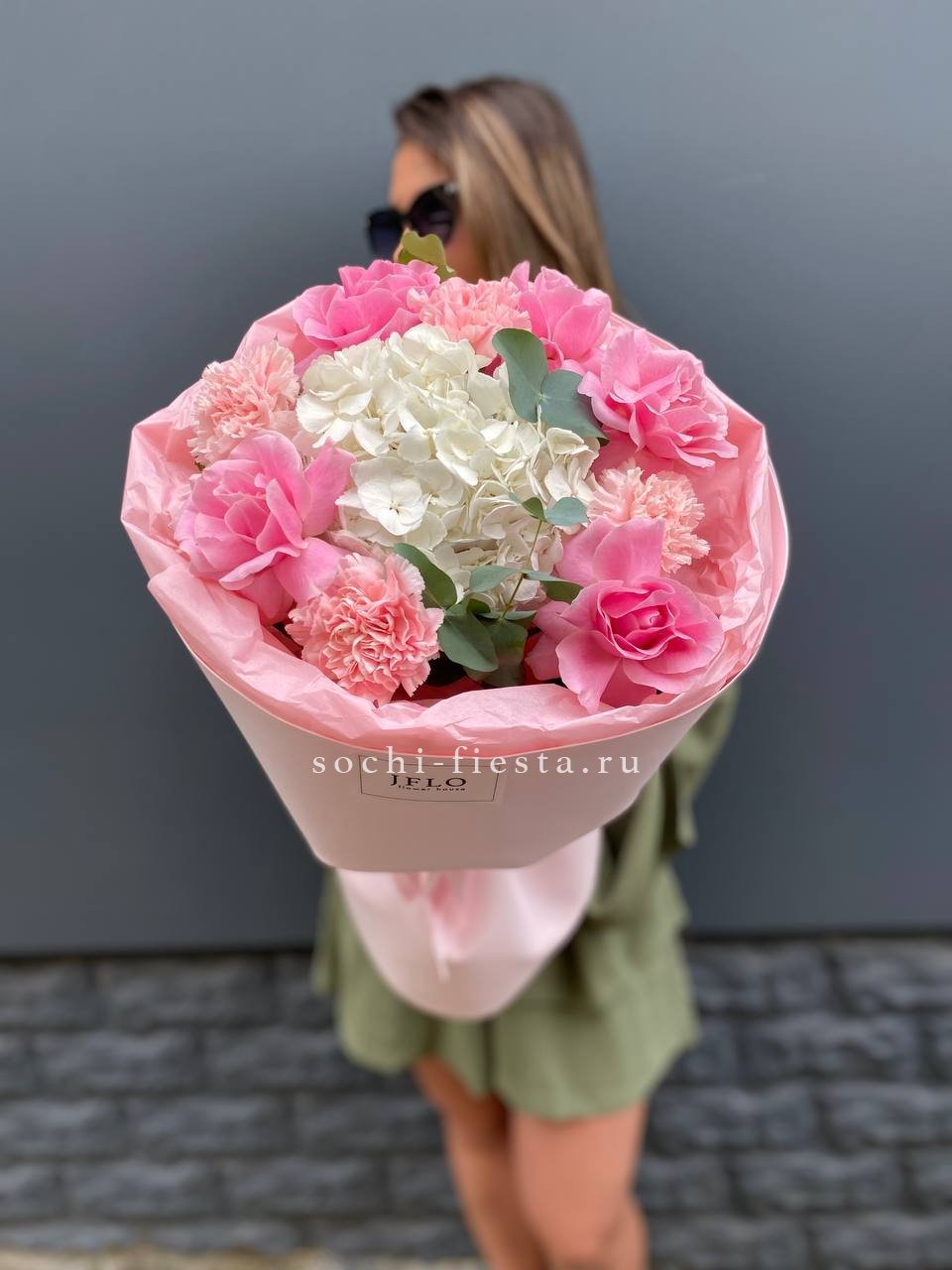 Сборный букет в составе которого гортензия, розовые розы, диантусы, эвкалипт,  лента, фоамиран