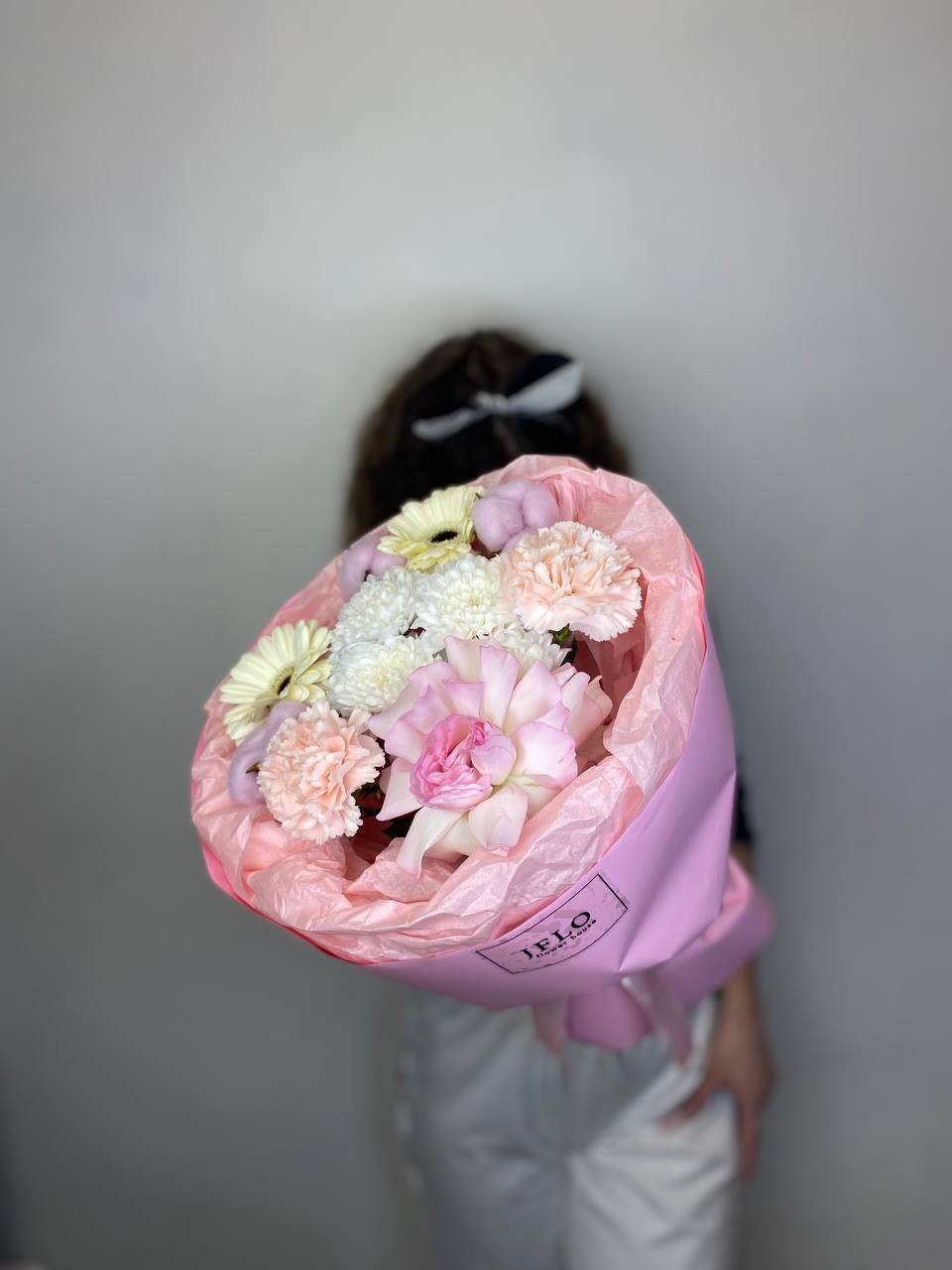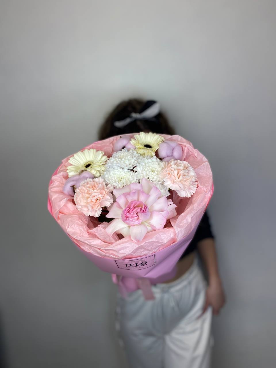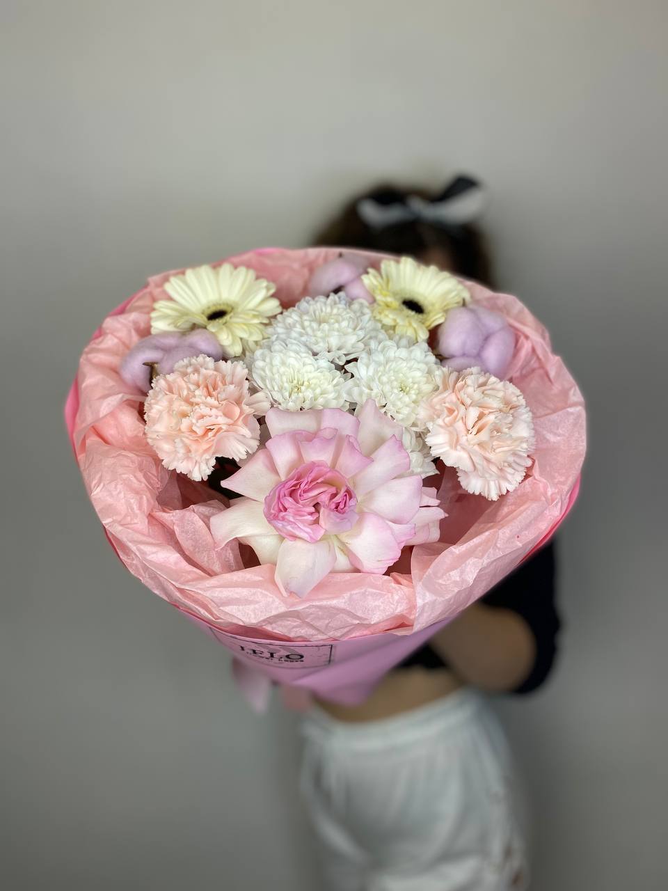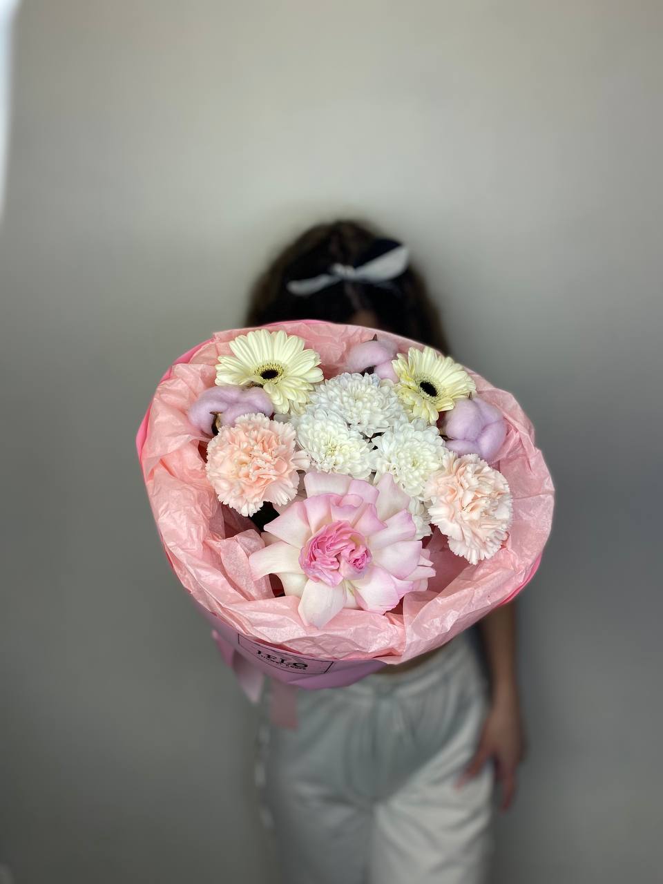 хризантема, диантус, гербера, роза, хлопок, упаковка.