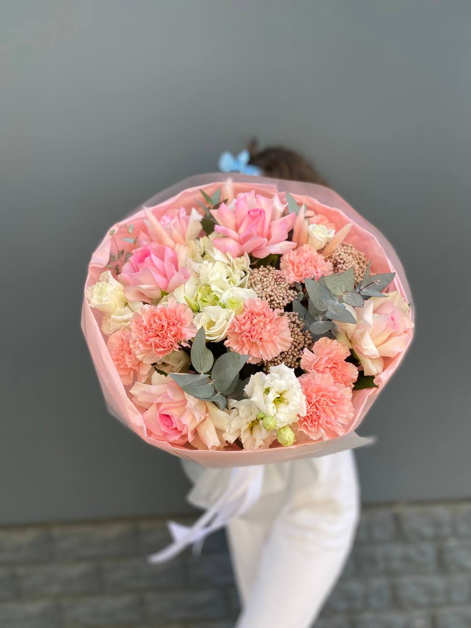 Плотная сборка с пышной гортензией в центре и рассыпчатыми соцветиями диантуса по краям. Эустома добавляет воздушности, а ветки озатамуса создают лёгкую графику. Букет держит форму и выглядит объёмно с любого ракурса.