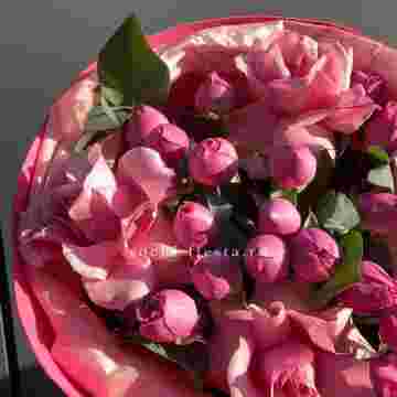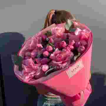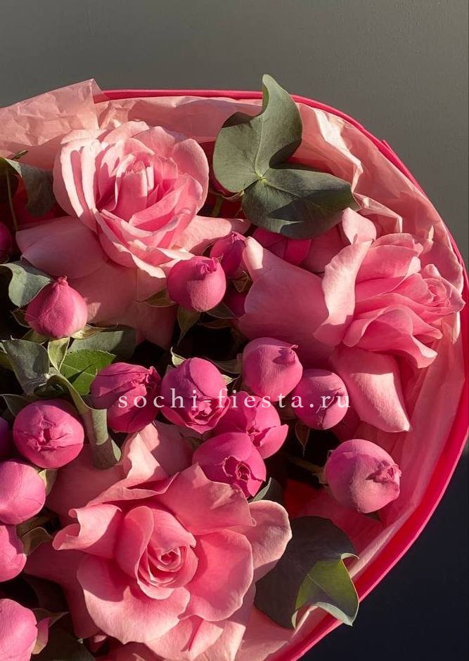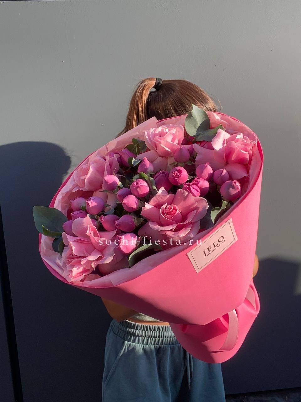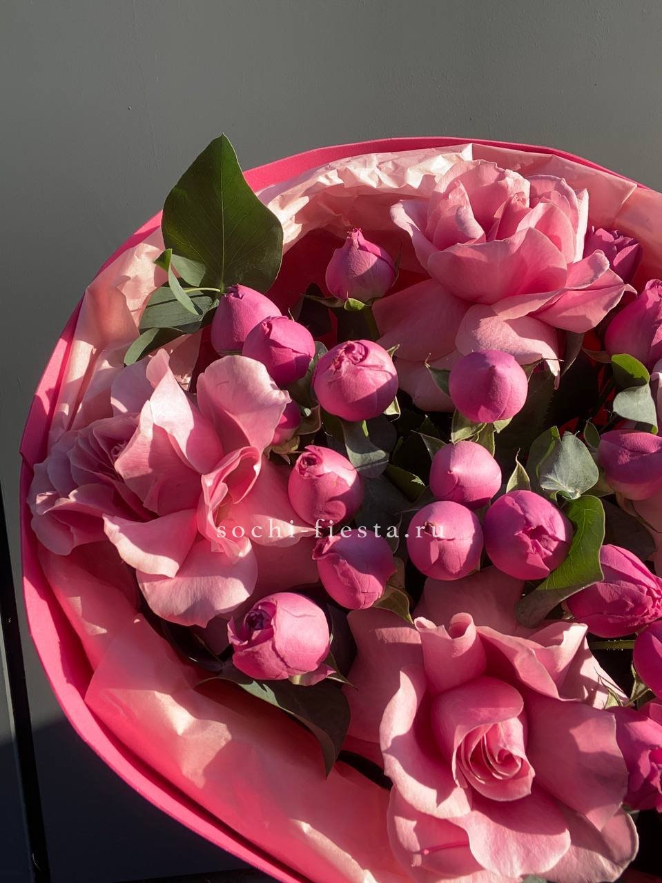 Состав: пионовидные розы, розовые розы, эвкалипт, лента, дизайнерская упаковка.