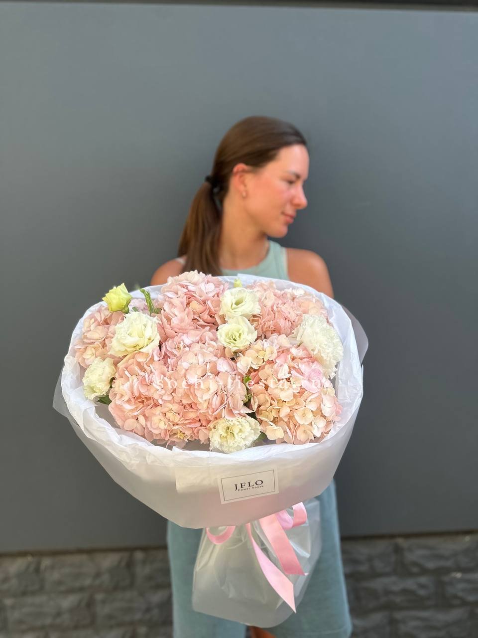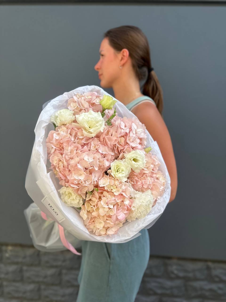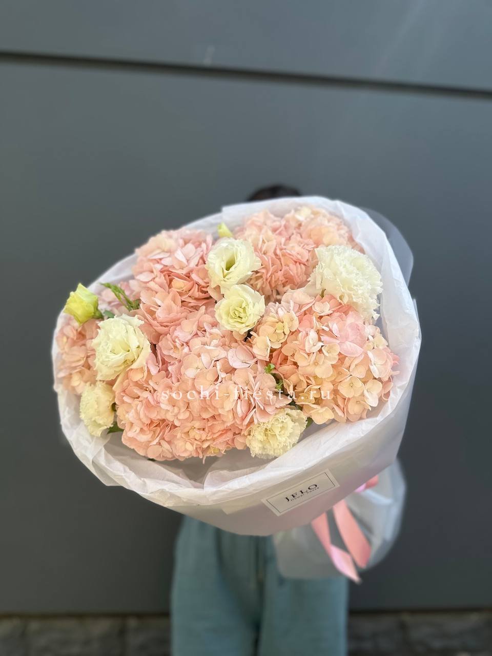 Авторский букет в составе которого гортензия, эустома,  лента и дизайнерская пленка.