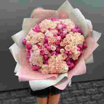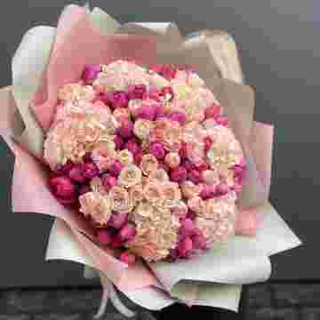 Состав: гортензия, диантус, роза, кустовая роза, эустома, эвкалипт, лента, авторская упаковка