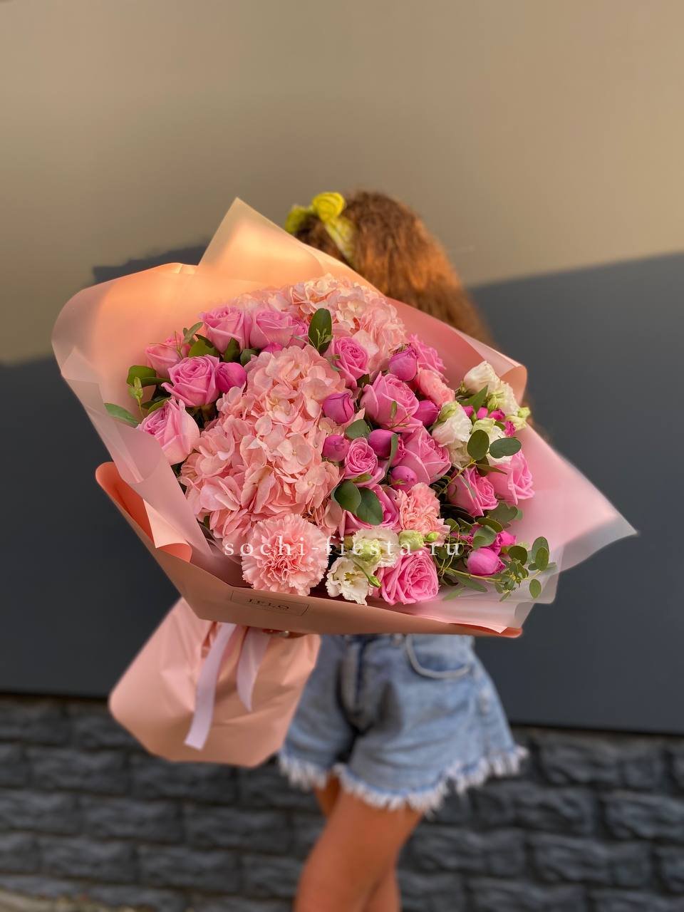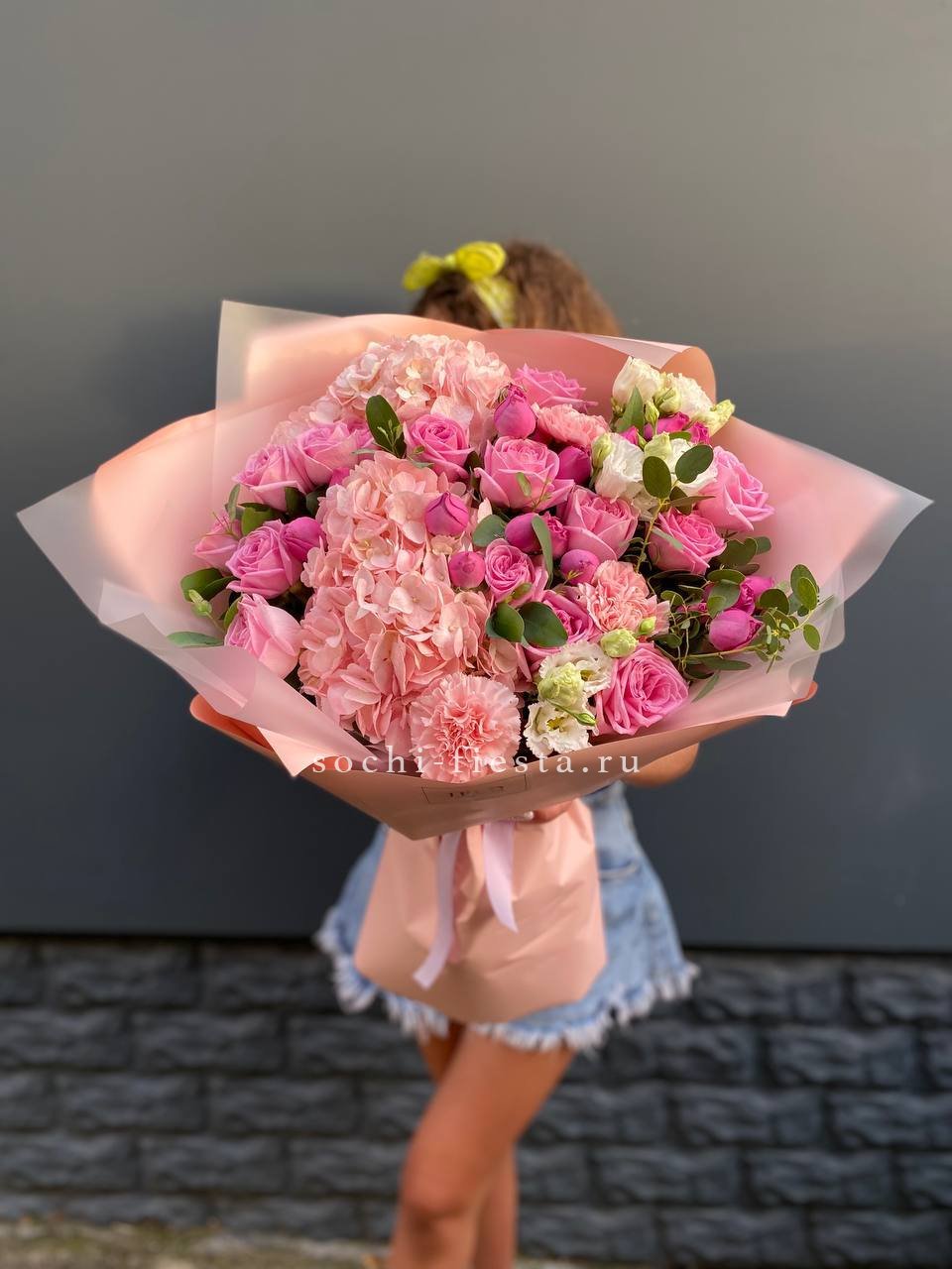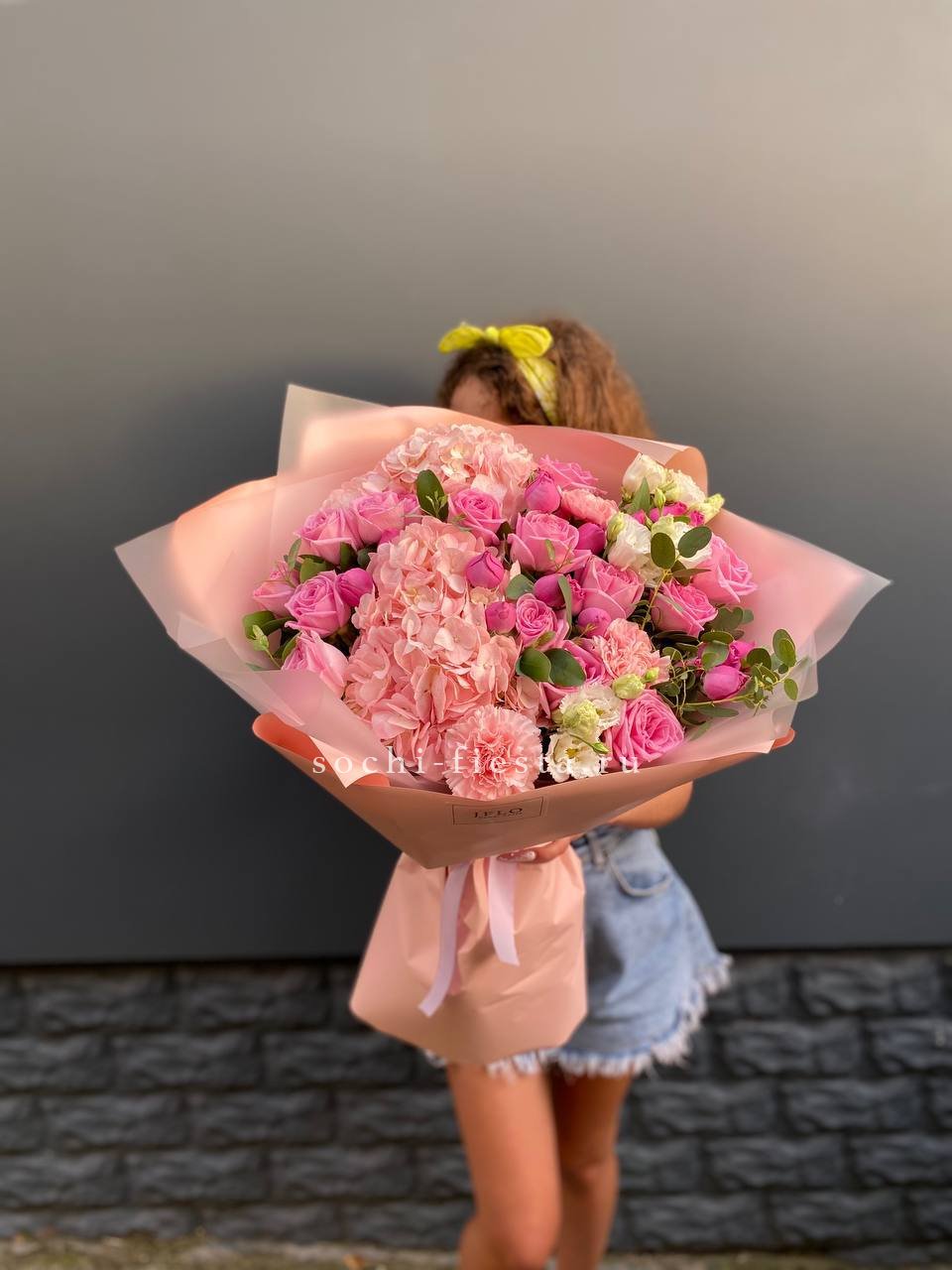 Состав: гортензия, мисти бабблс, роза, эустома, диантус, эвкалипт, авторская упаковка, лента