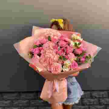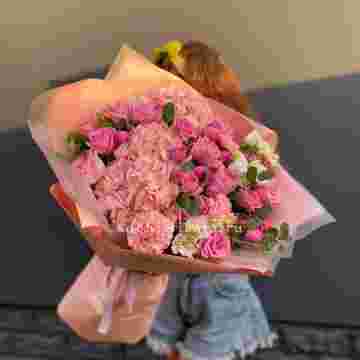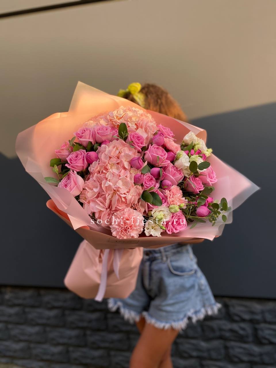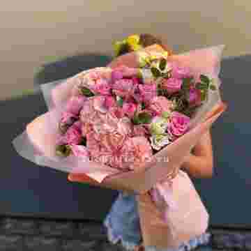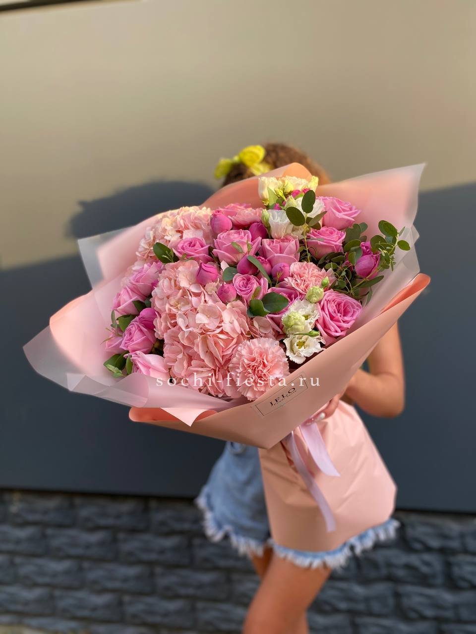Состав: гортензия, мисти бабблс, роза, эустома, диантус, эвкалипт, авторская упаковка, лента