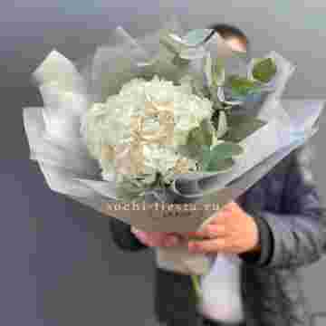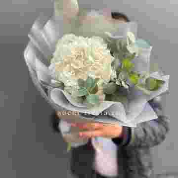 Состав: гортензия, диантус, кустовая пионовидная роза, эустома, орхидеи (или аналог), эвкалипт, лента, дизайнерская упаковка