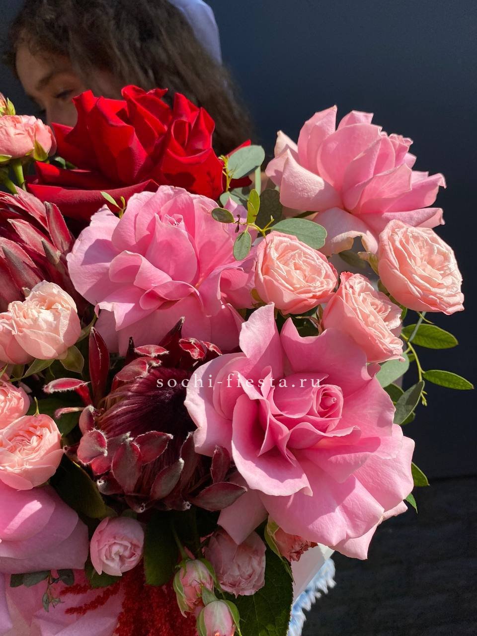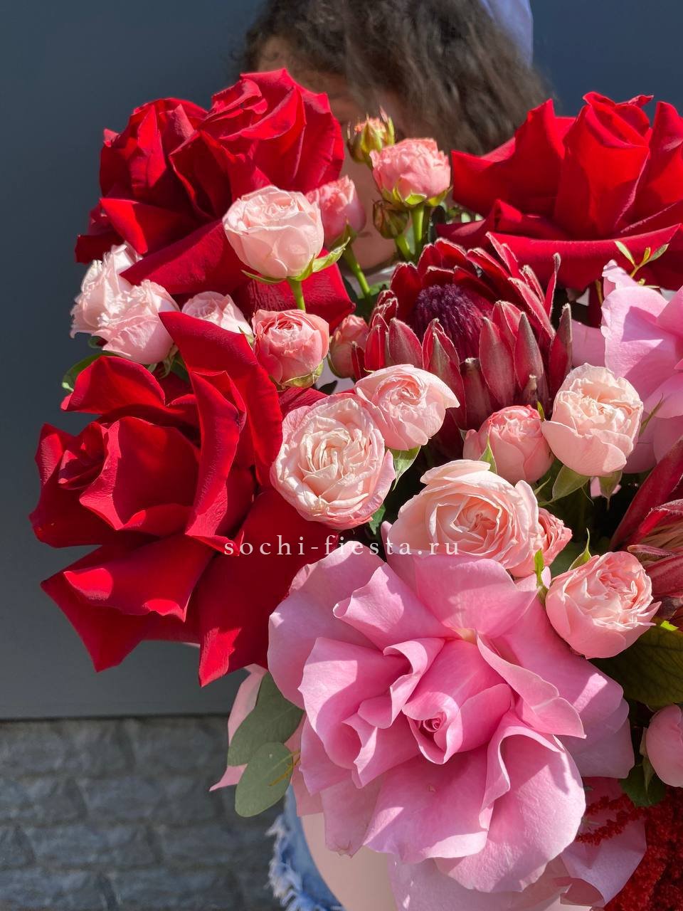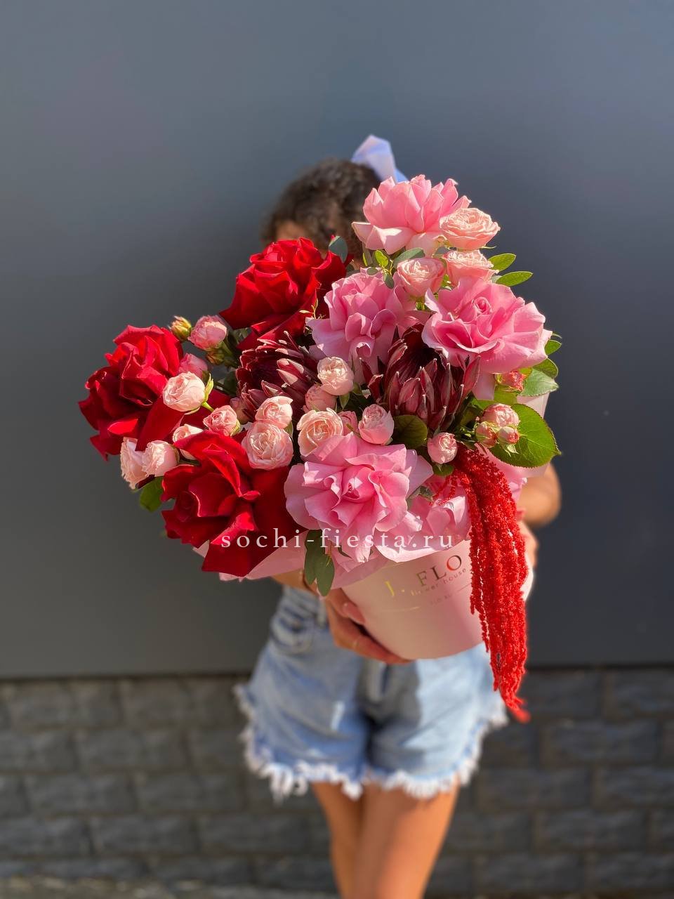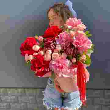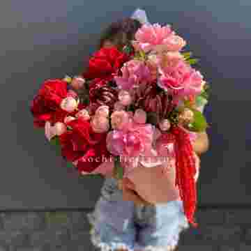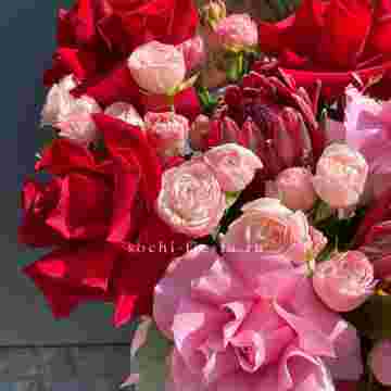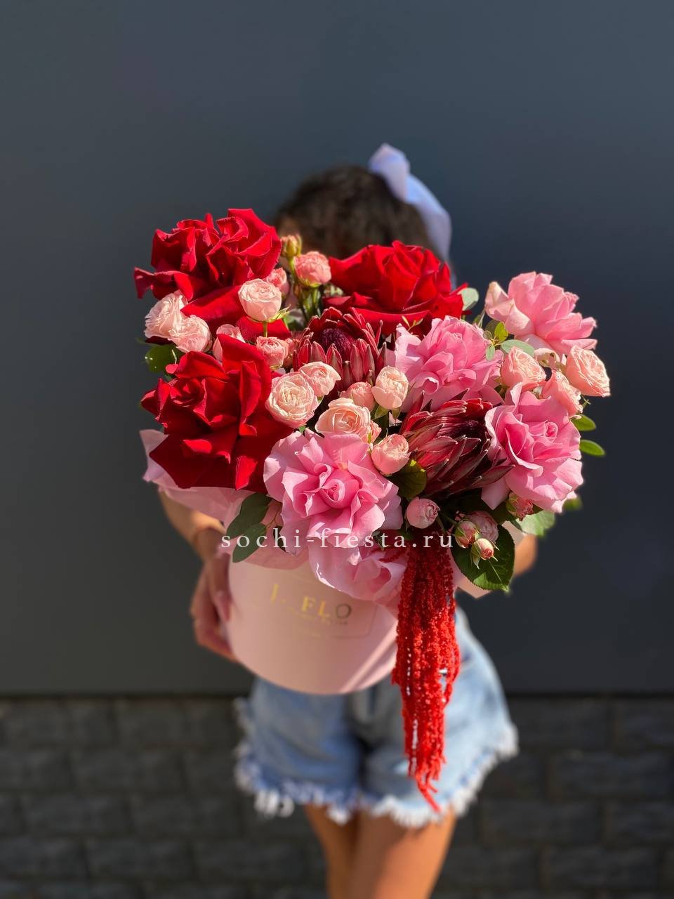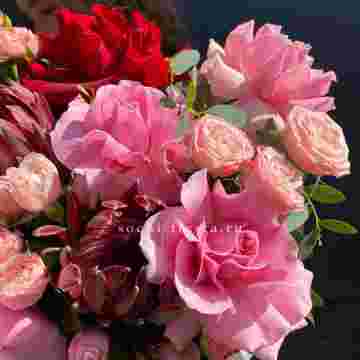 Состав: протеи, розовые розы, красные розы, кустовые розы, амарант, тишью, цилиндр D16