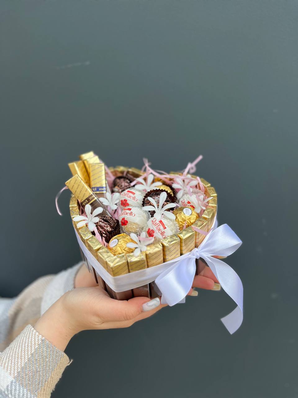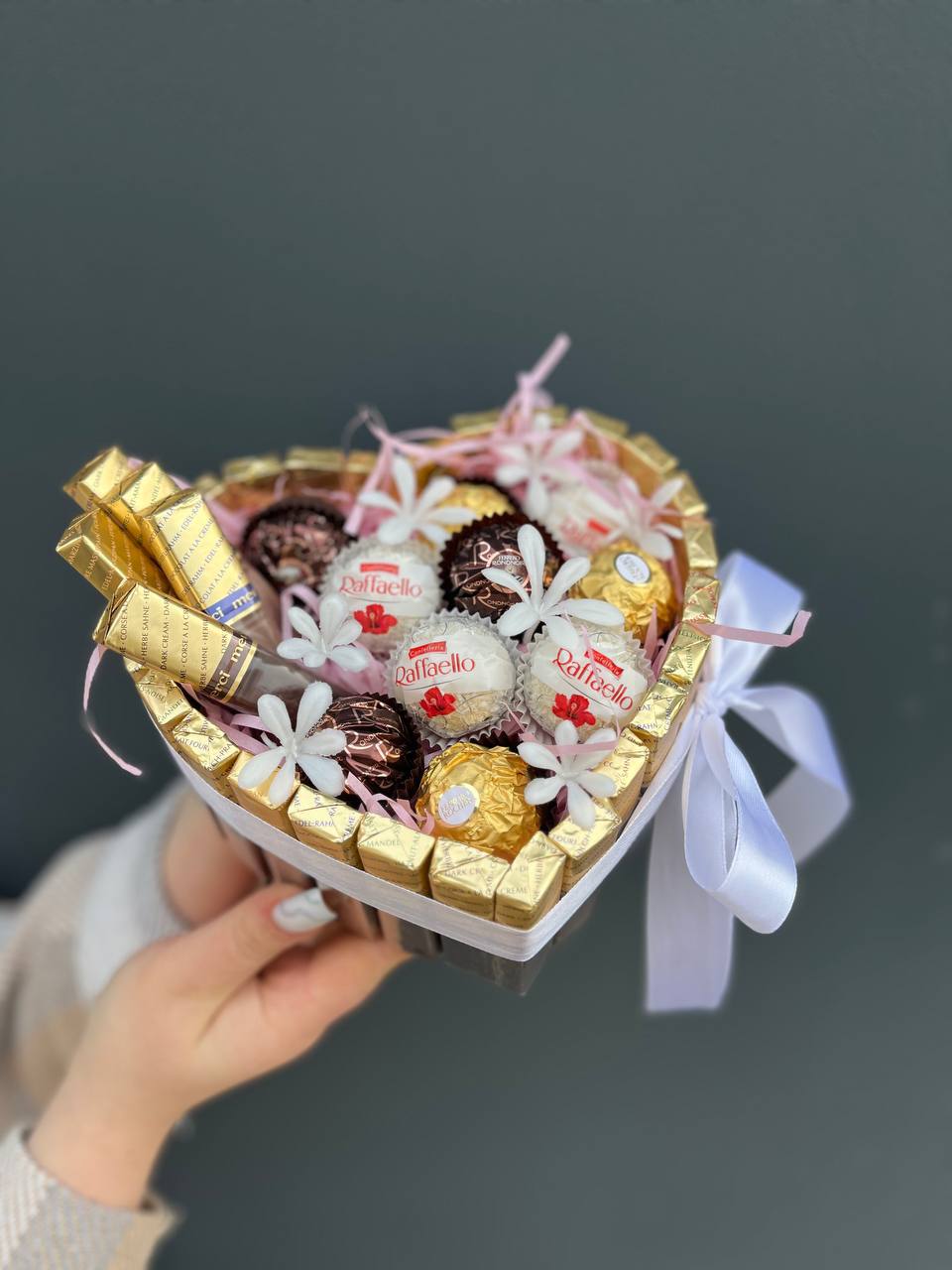 Состав: шоколад мерси, ферреро, рафаэло с искуственными цветочками в коробочке сердце