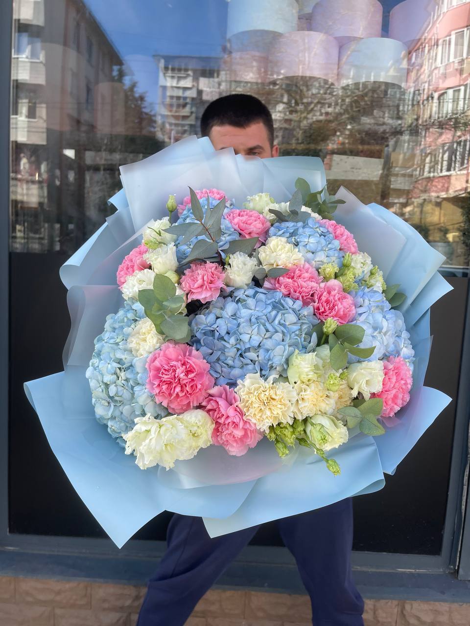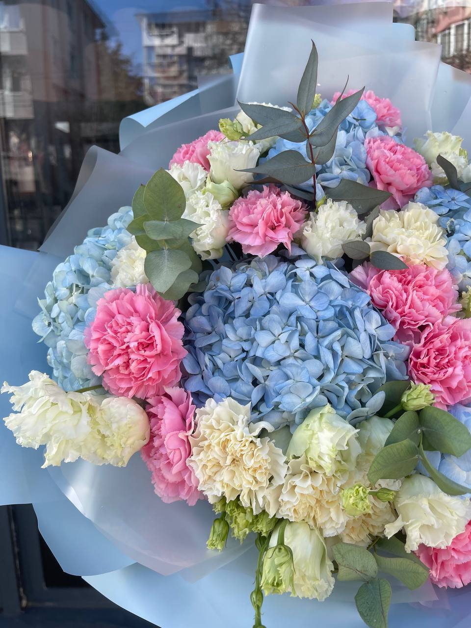 Пионовидные розы соседствуют с классическими, создавая игру объёмов и плотности бутонов. Диантус вплетается между ними легкими штрихами. Эвкалипт добавляет воздуха и завершает силуэт.