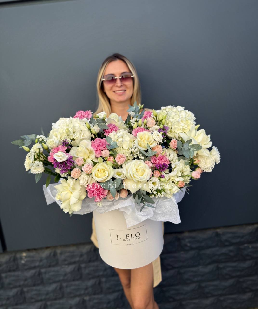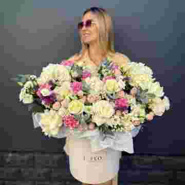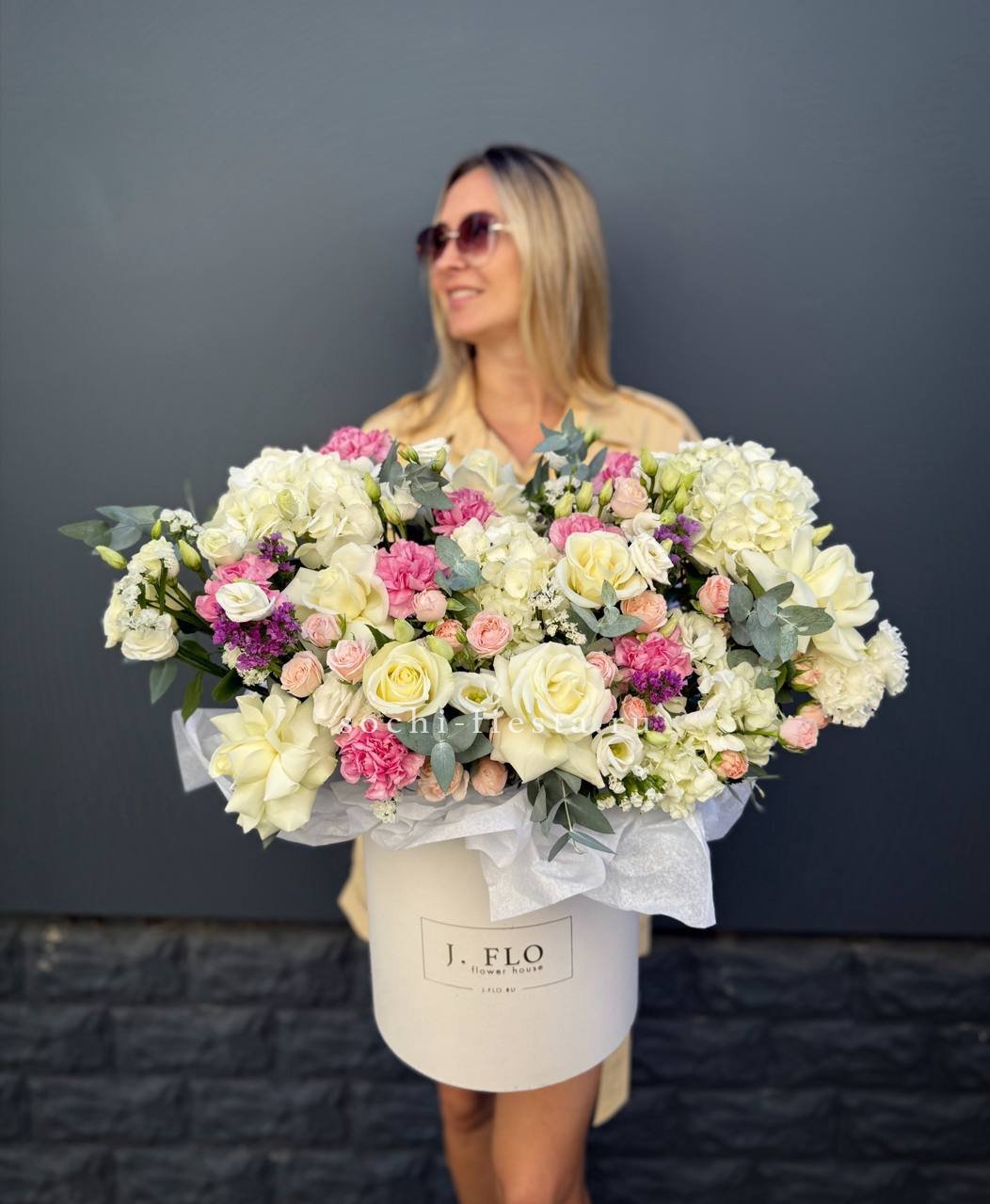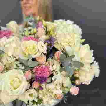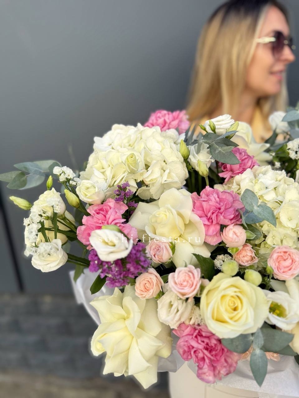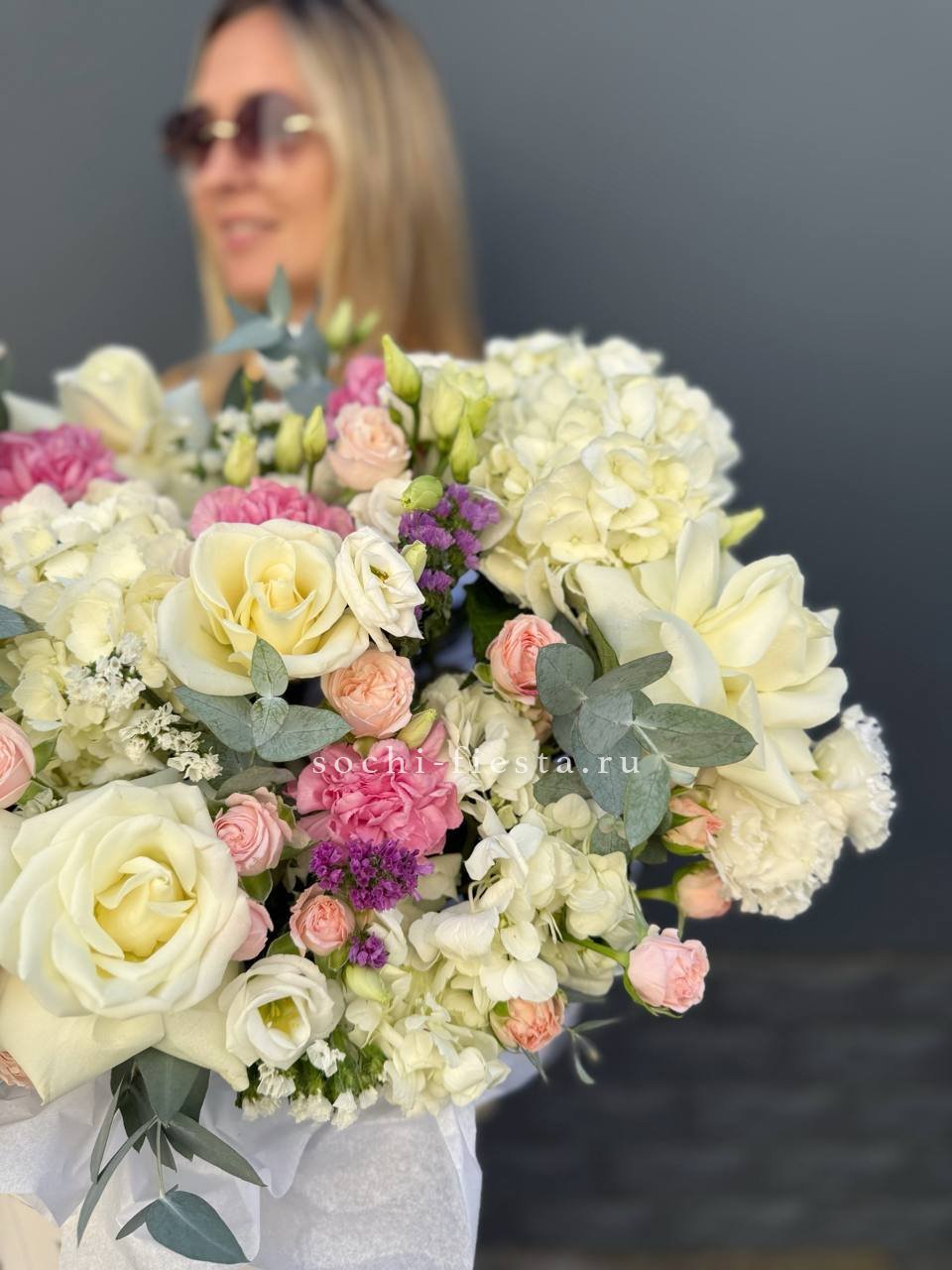 Состав: эустома, гортензия, белая роза, диантус, статица, бомбастик, бокс