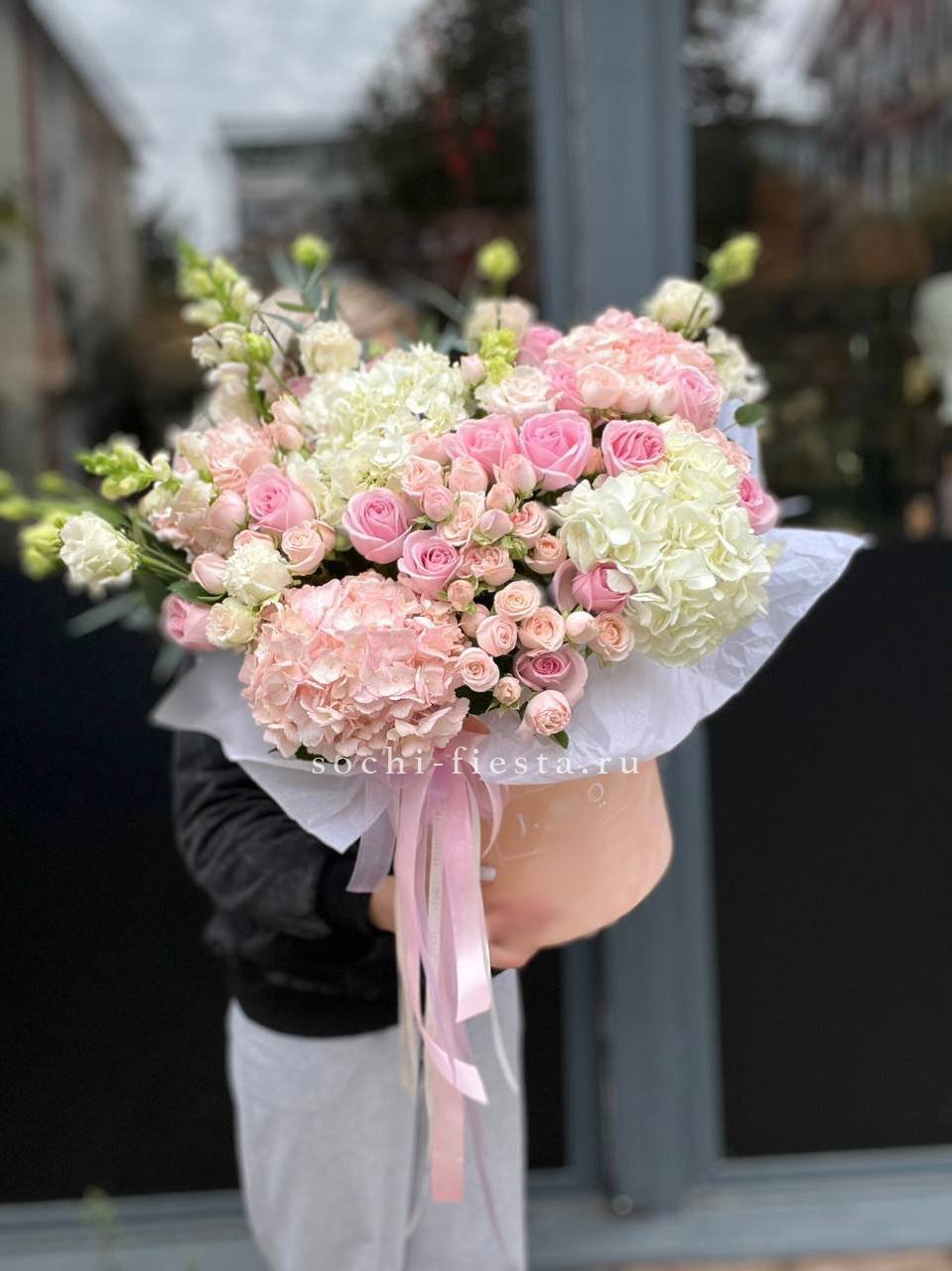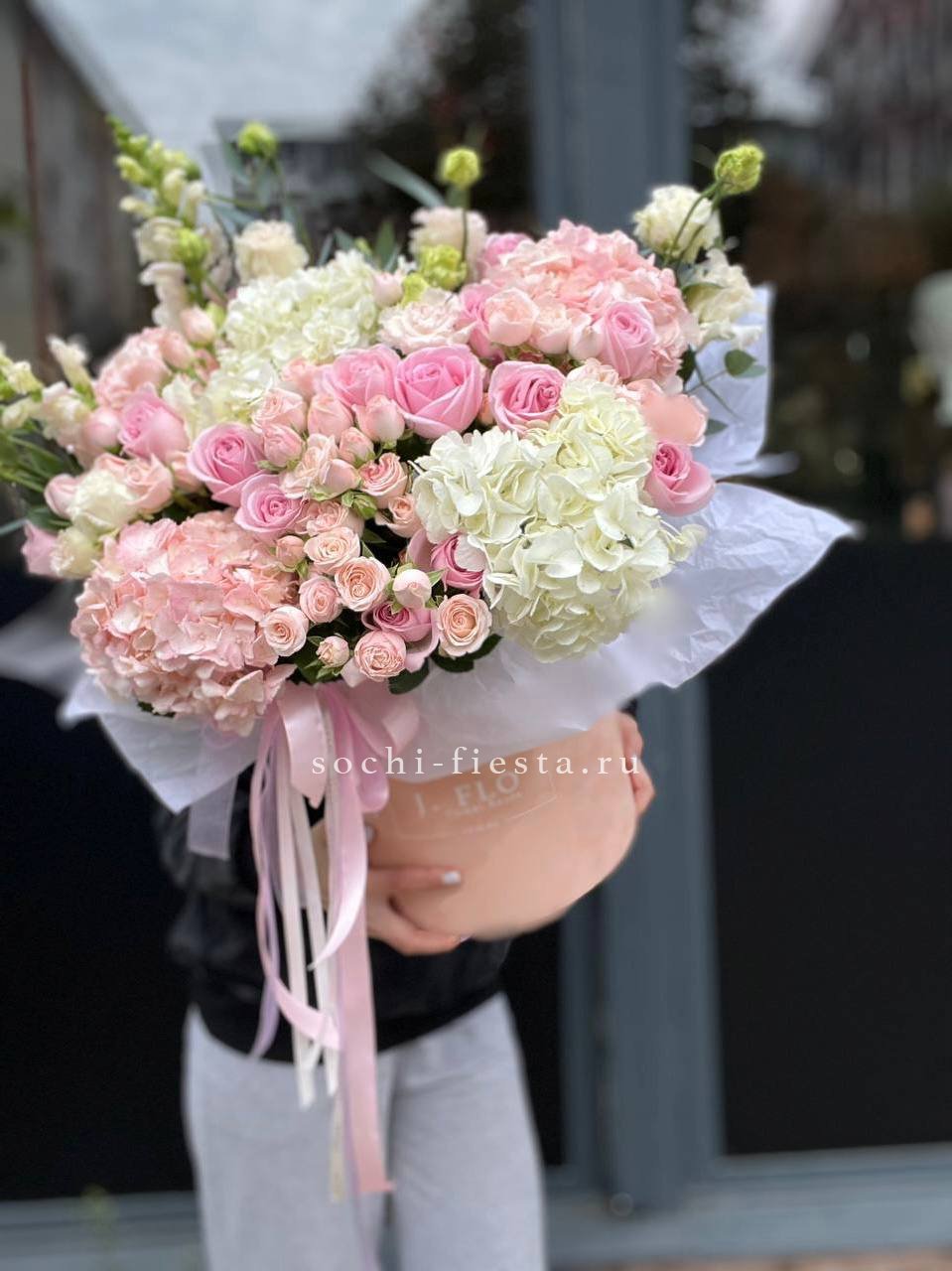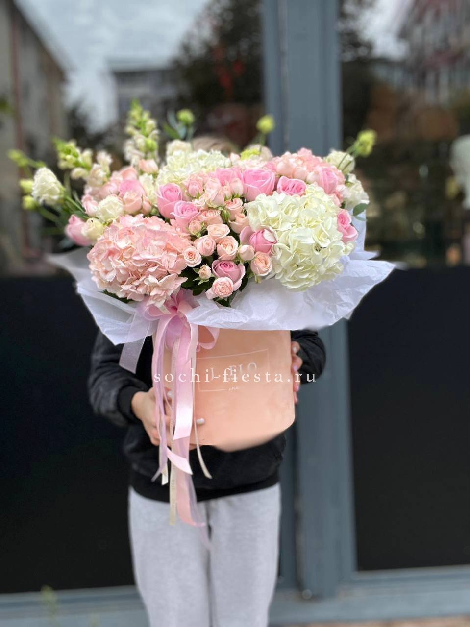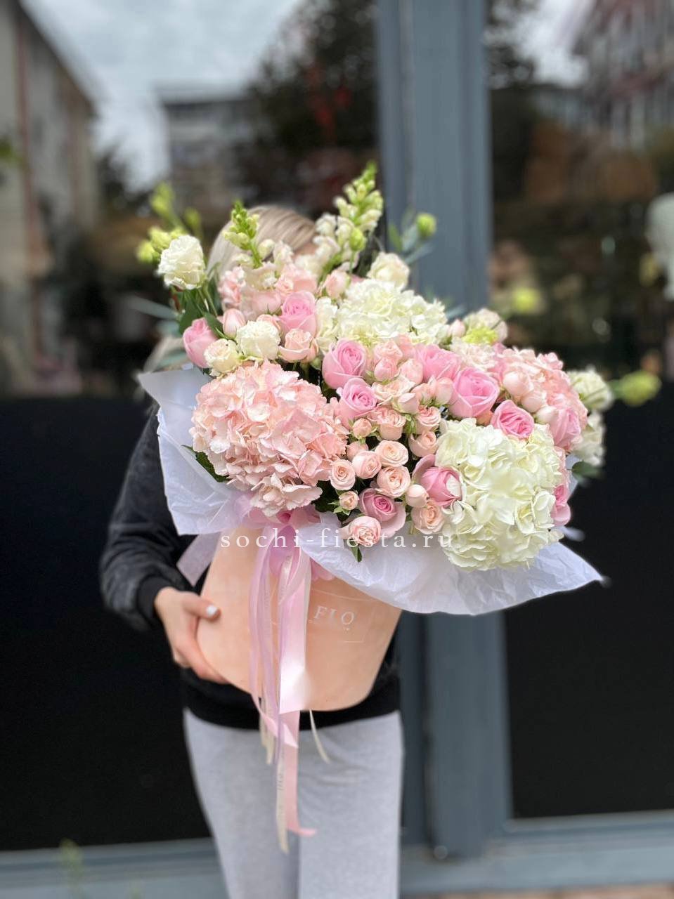 Состав: гортензии, эустома, розы, бомбастик, эвкалипт, антиринум в боксе 25