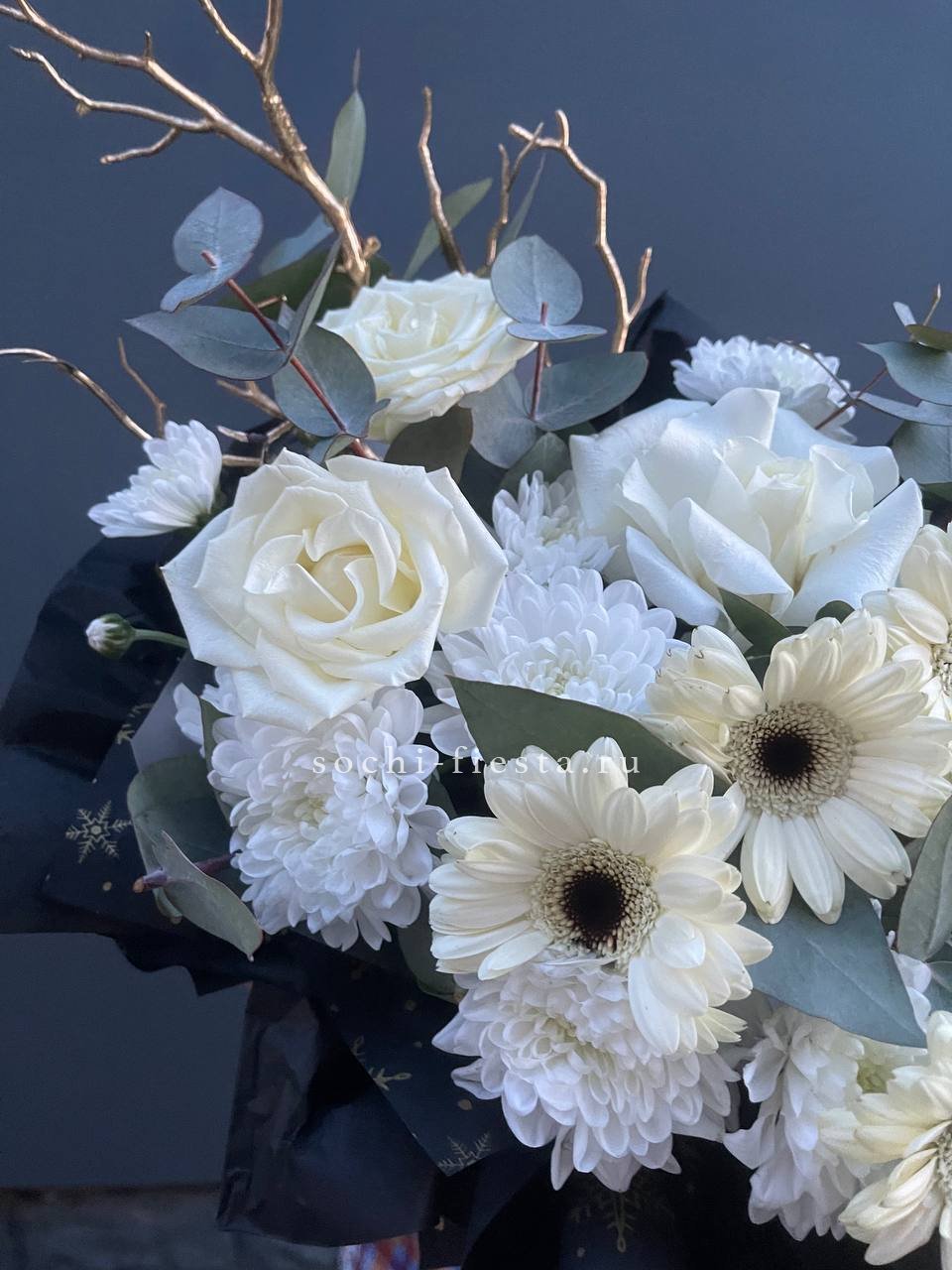 Белоснежная композиция из стойких цветов с элементами новогоднего декора)
