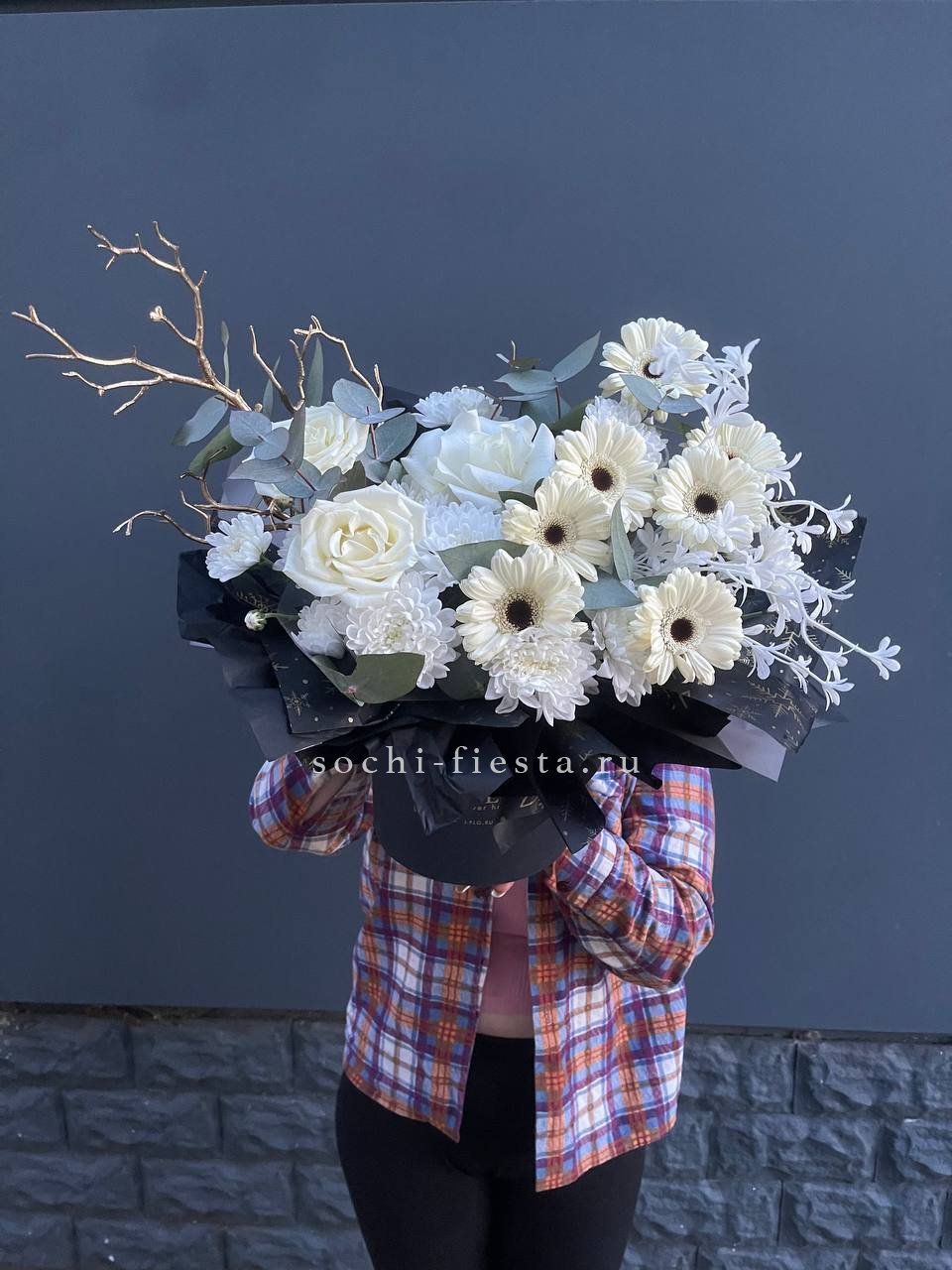 Состав: герберы, хризантемы, белые розы, бокс 16 с элементами декора