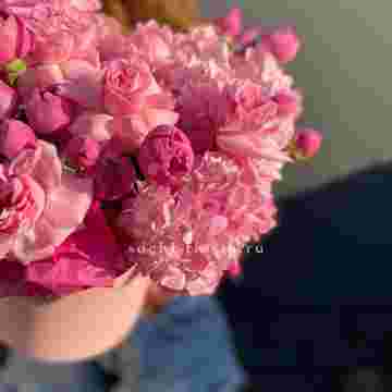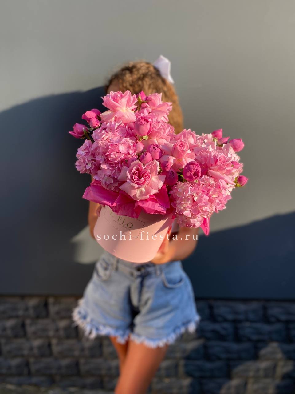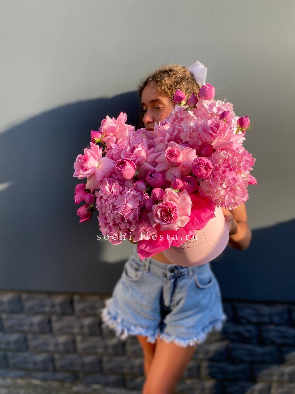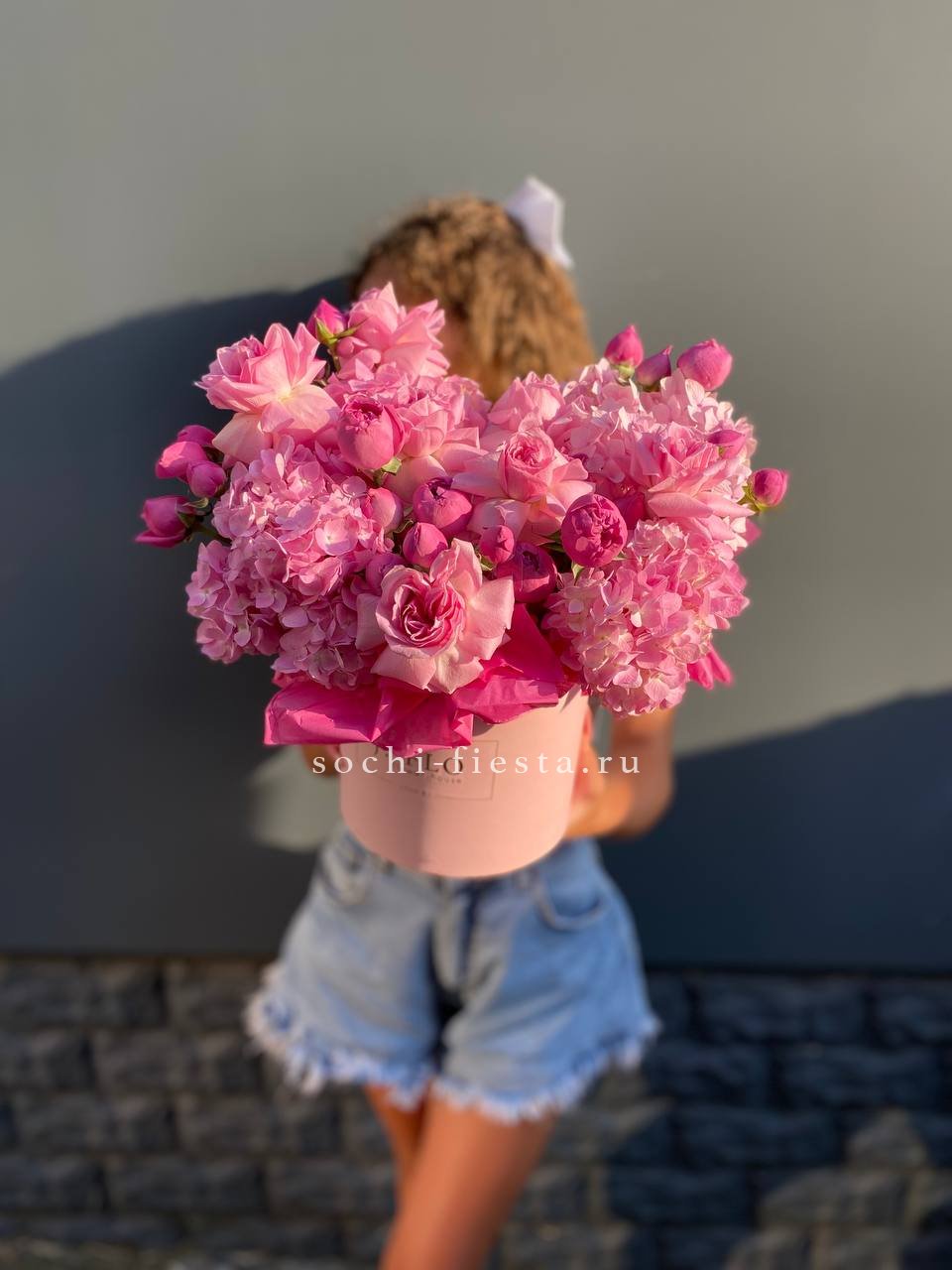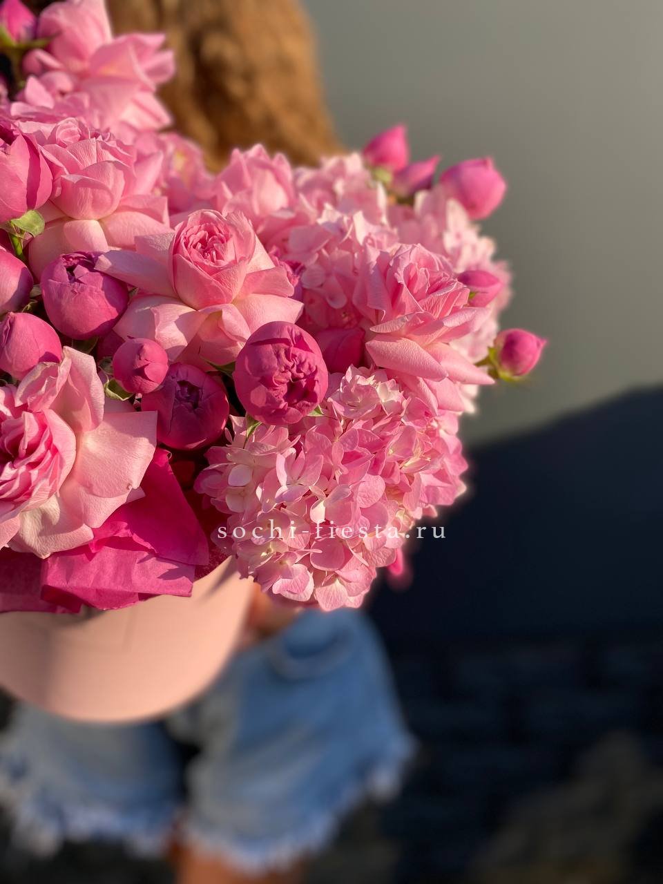 Состав: мисти баблс, гортензия, розовая роза, коробка размер 16D