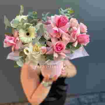Состав: цветочная композиция в нежно-сиреневых тонах в сиреневом цилиндре D25