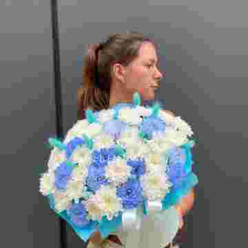 Состав: французские розы, диантусы, маттиола,  цилиндр D13, эвкалипт, лента, упаковка