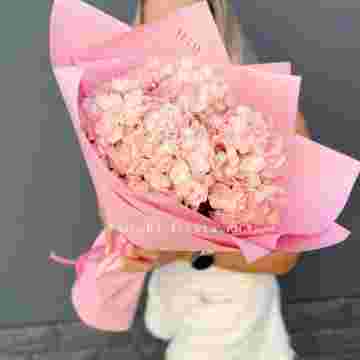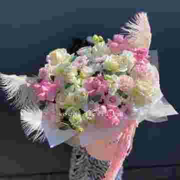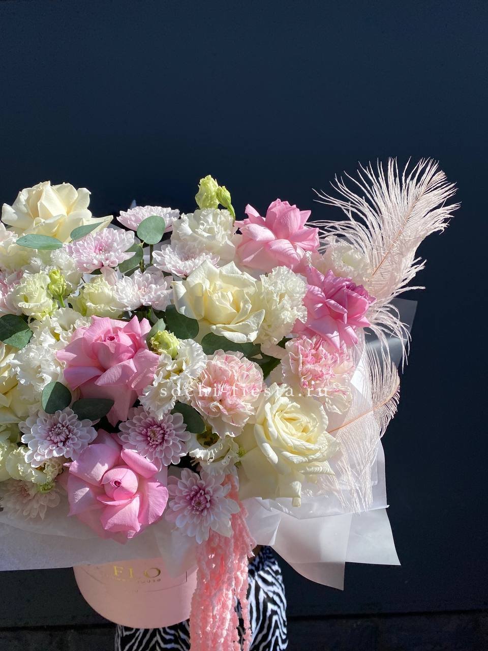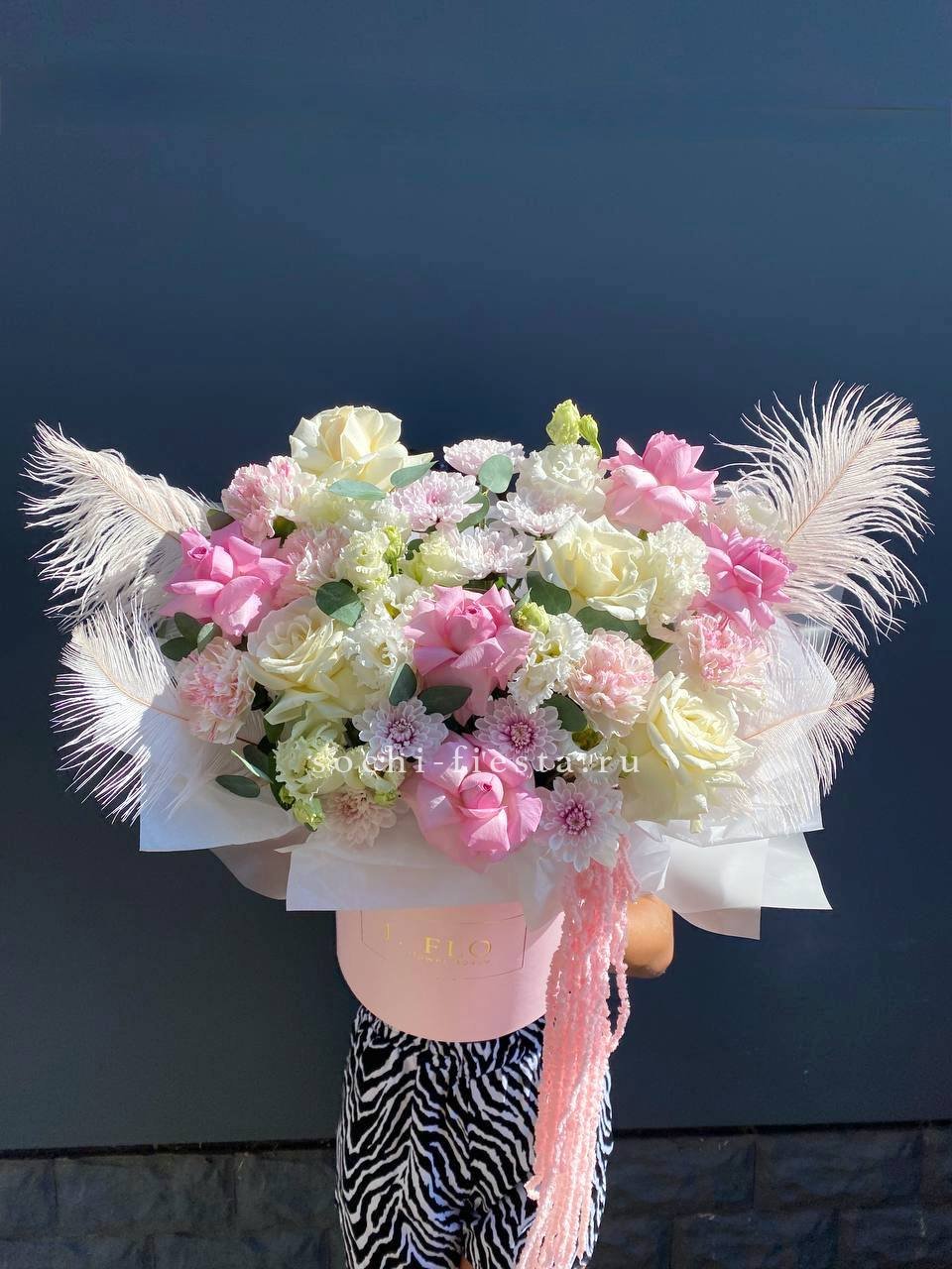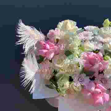 Дизайнерский бокс в составе которого: французские розы, диантусы, хризантемы,  эустома, амарантус, перья