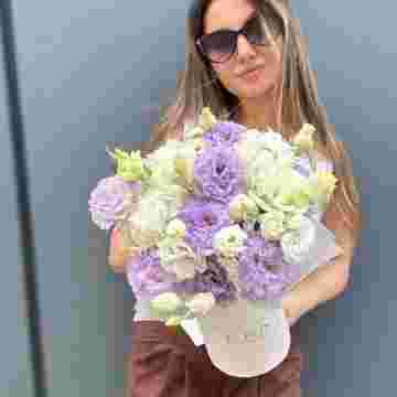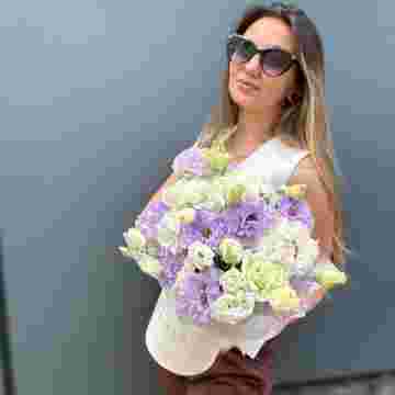 Состав: эустома, пионы, цилиндр D13, эвкалипт, лента, упаковка