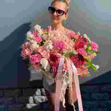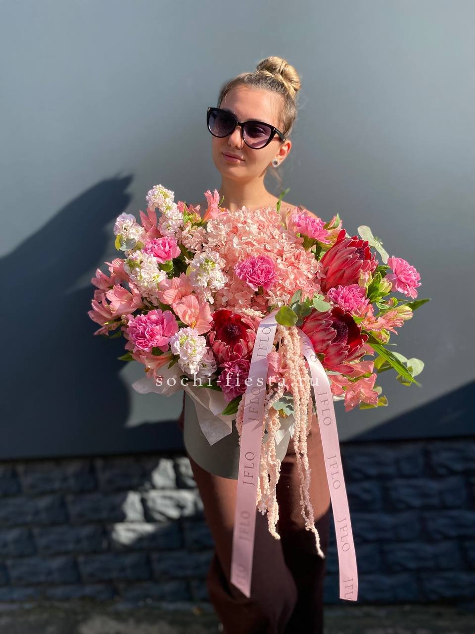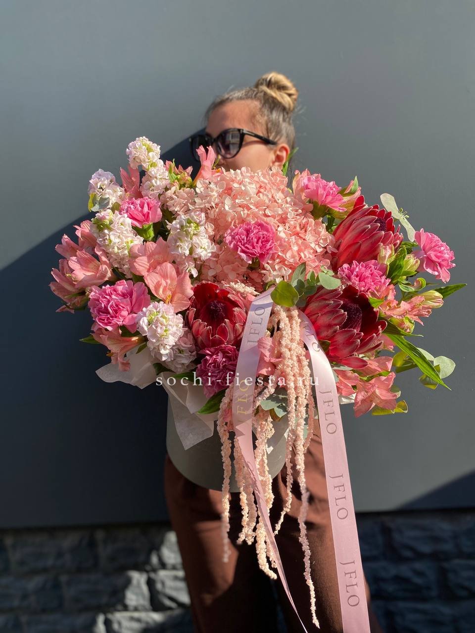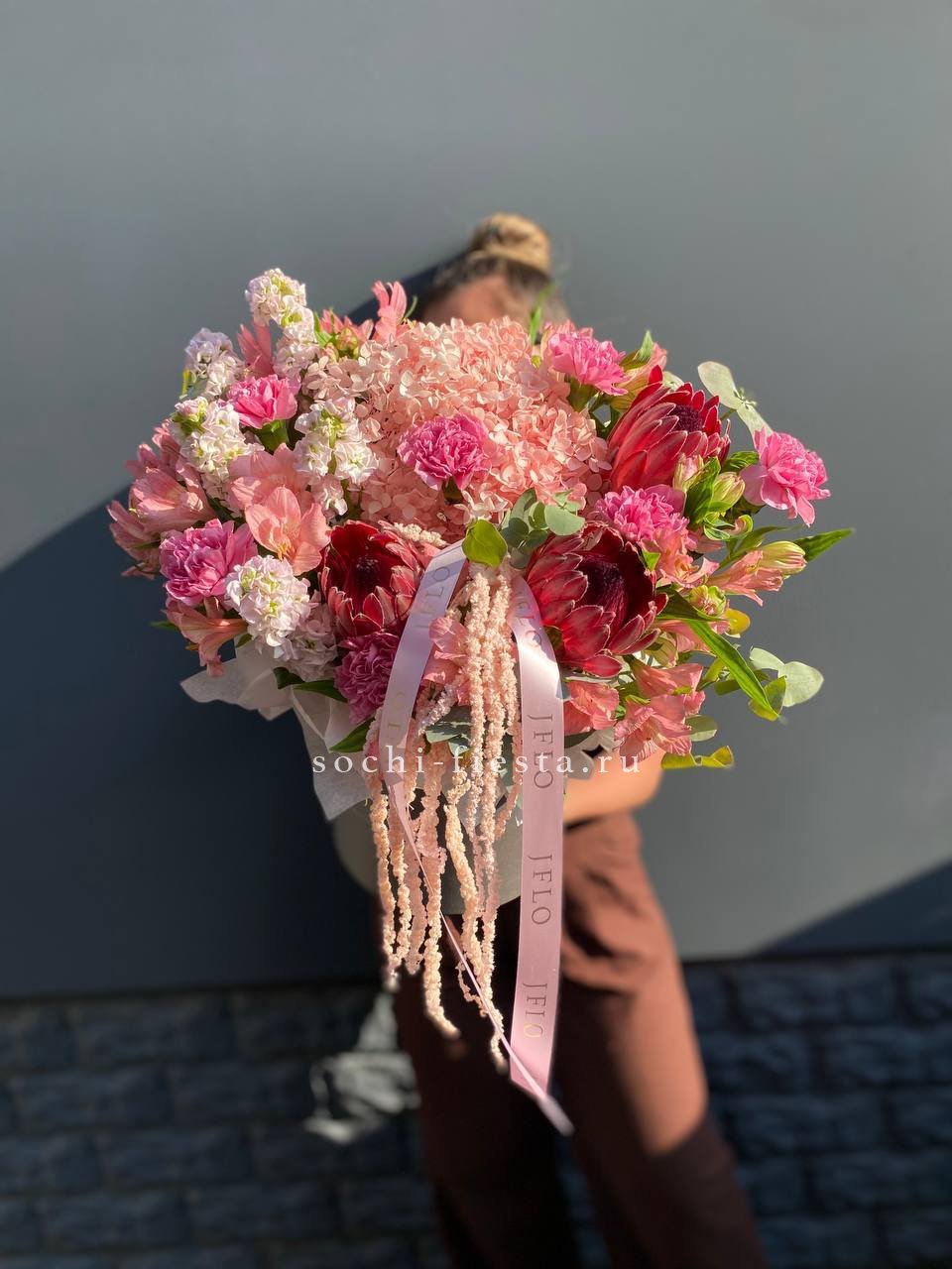 Состав: протеи,диантусы,альстроерии,маттиола, цилиндр D20, эвкалипт, лента, тишью.
