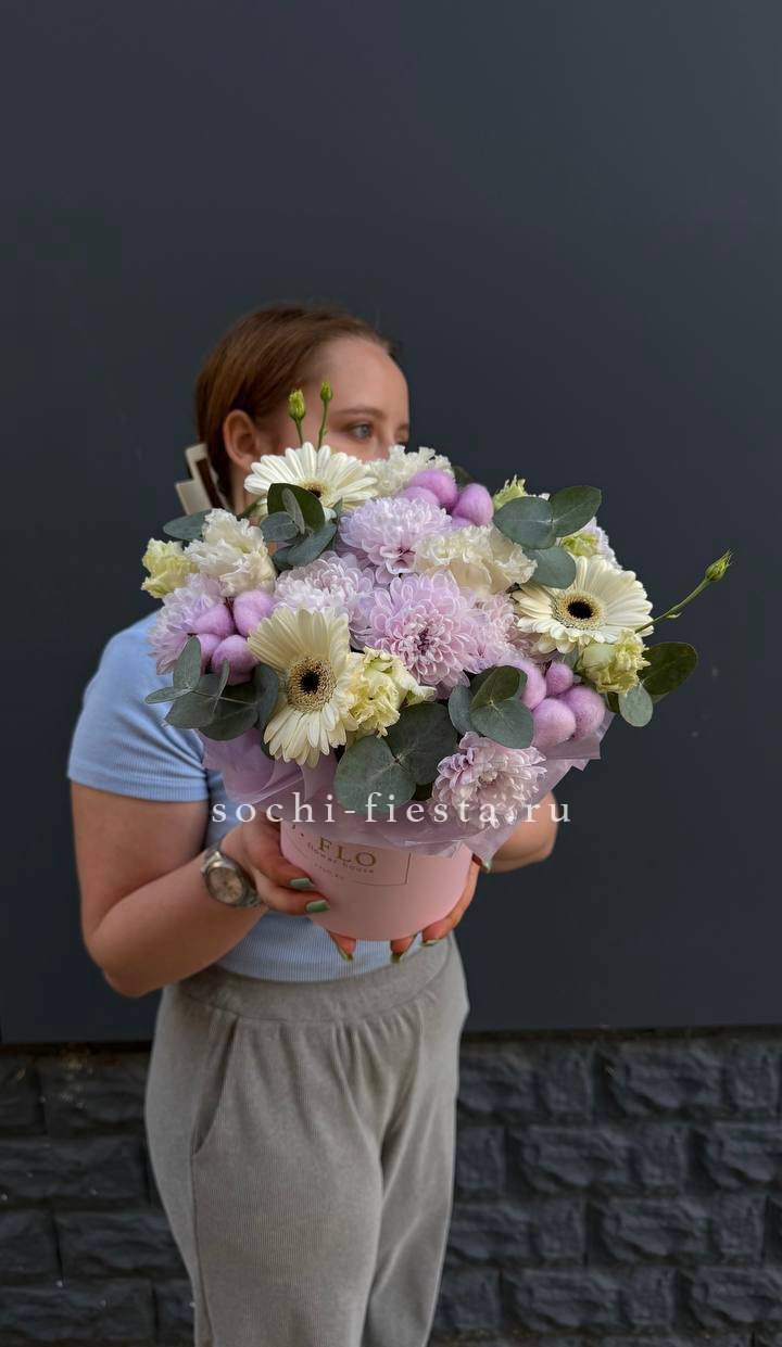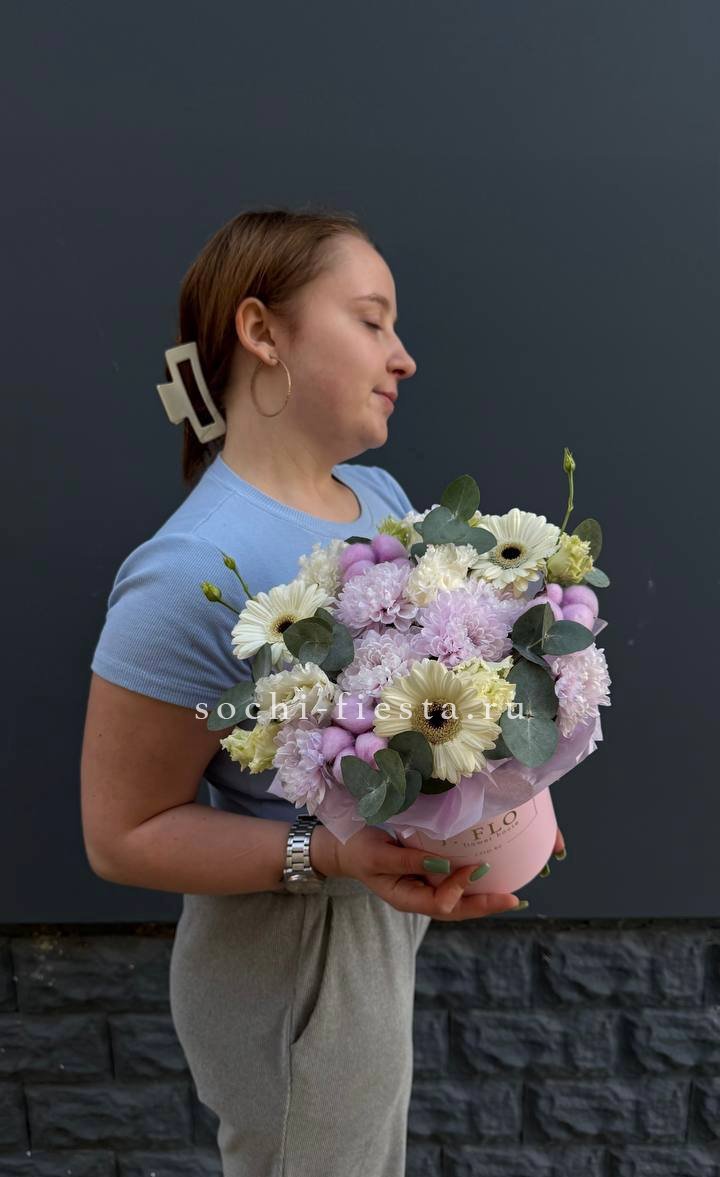 Состав: сборный нежный бокс из хризантемы, хлопка, герберы и эустомы