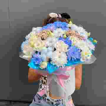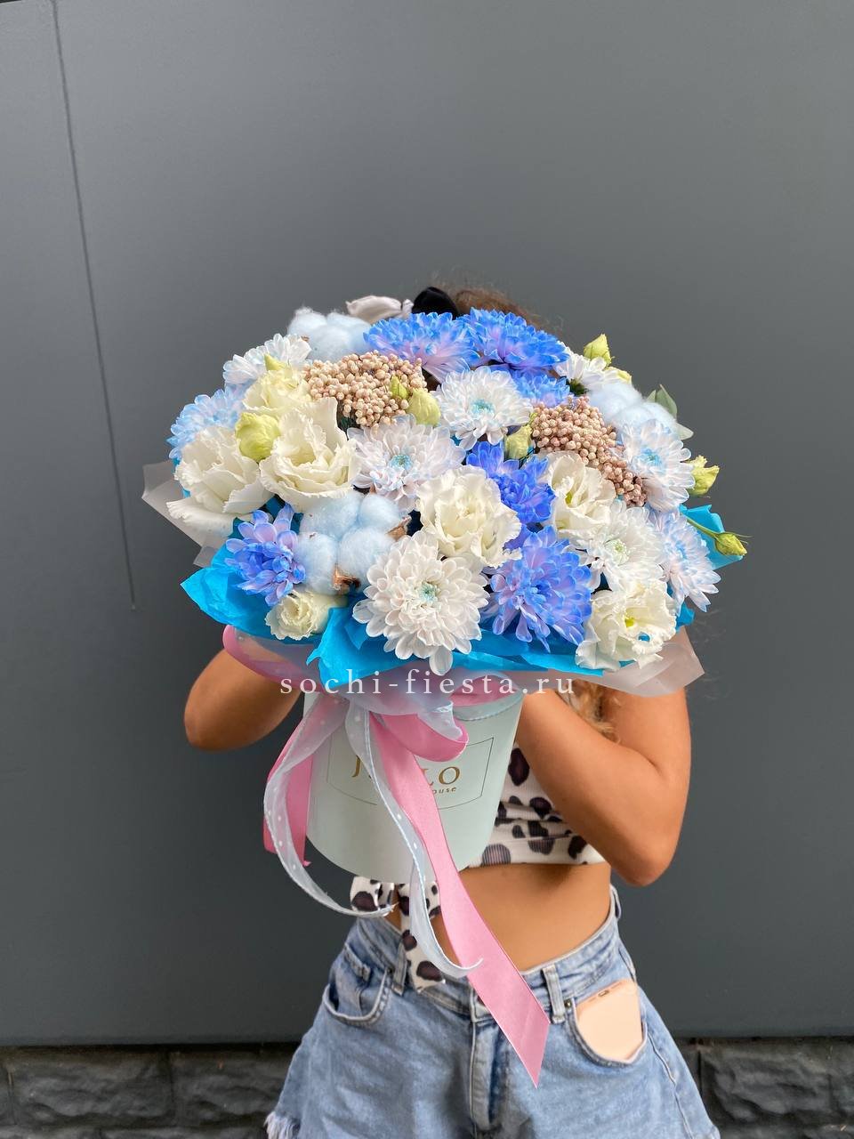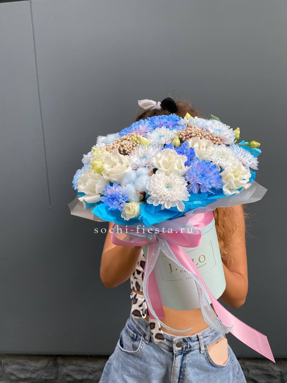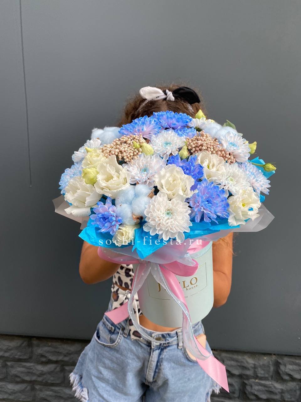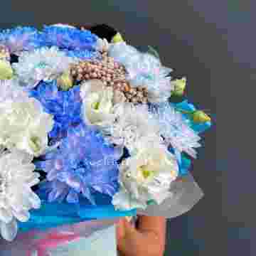 Состав коробки : хризантема кустовая, озотамус, эустома, хлопок