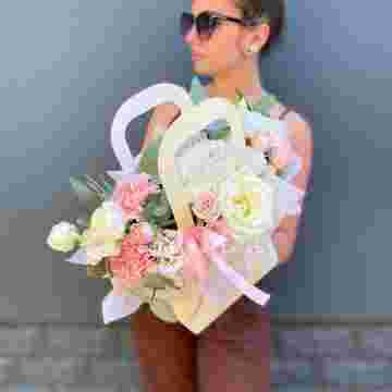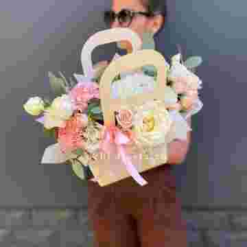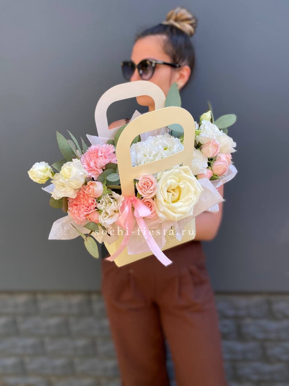 Состав: эустома, кустовые розы, белые розы, диантусы, лента, сумка-кашпо.
