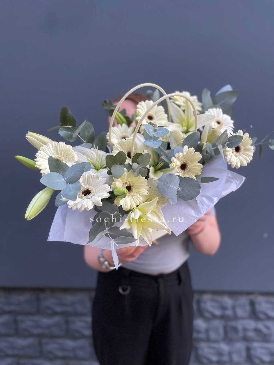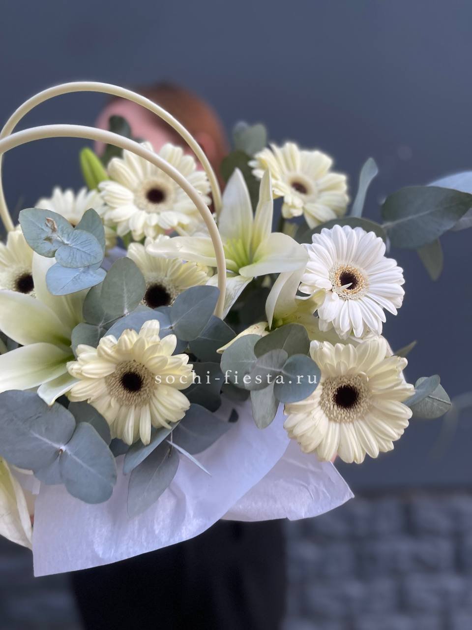 Состав: сумочка в белых тонах с лилией, герберой и эвкалиптом