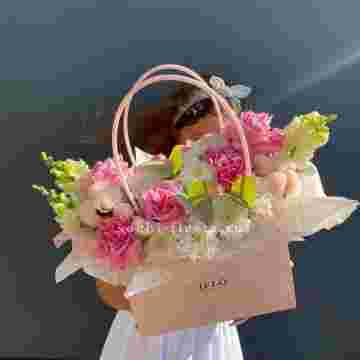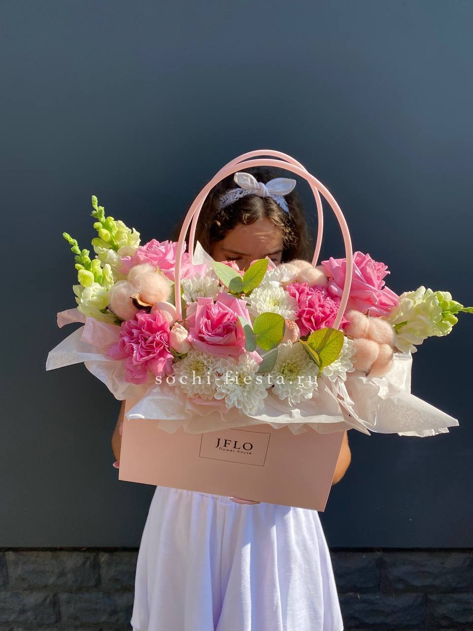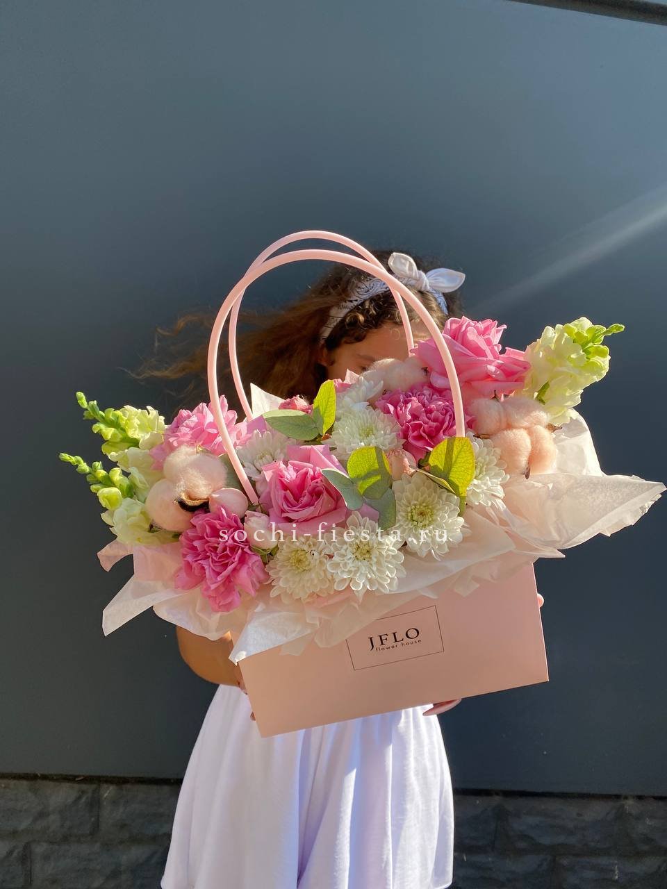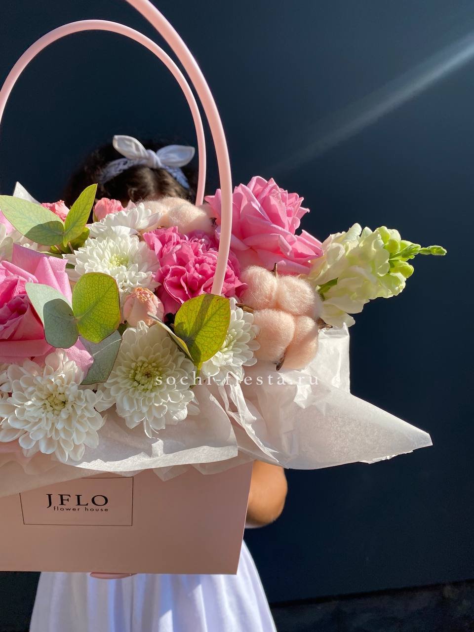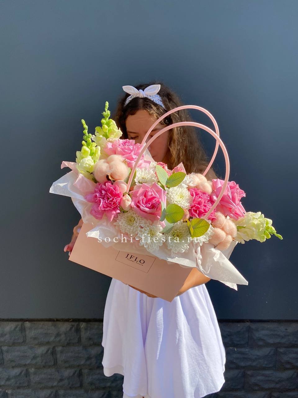 Состав: розовая роза, хризантема, хлопок, антирринум, диантус