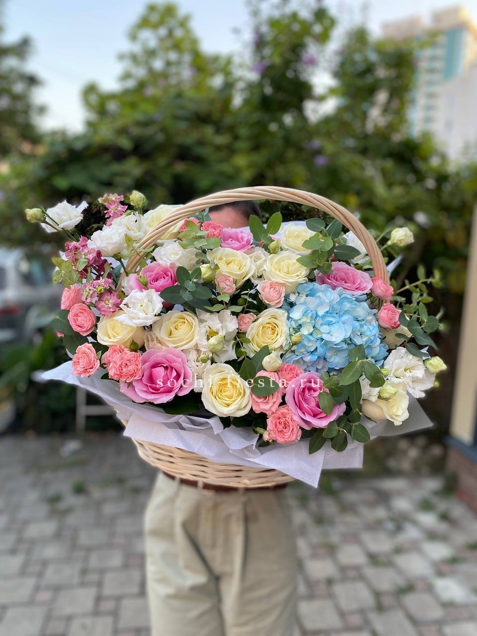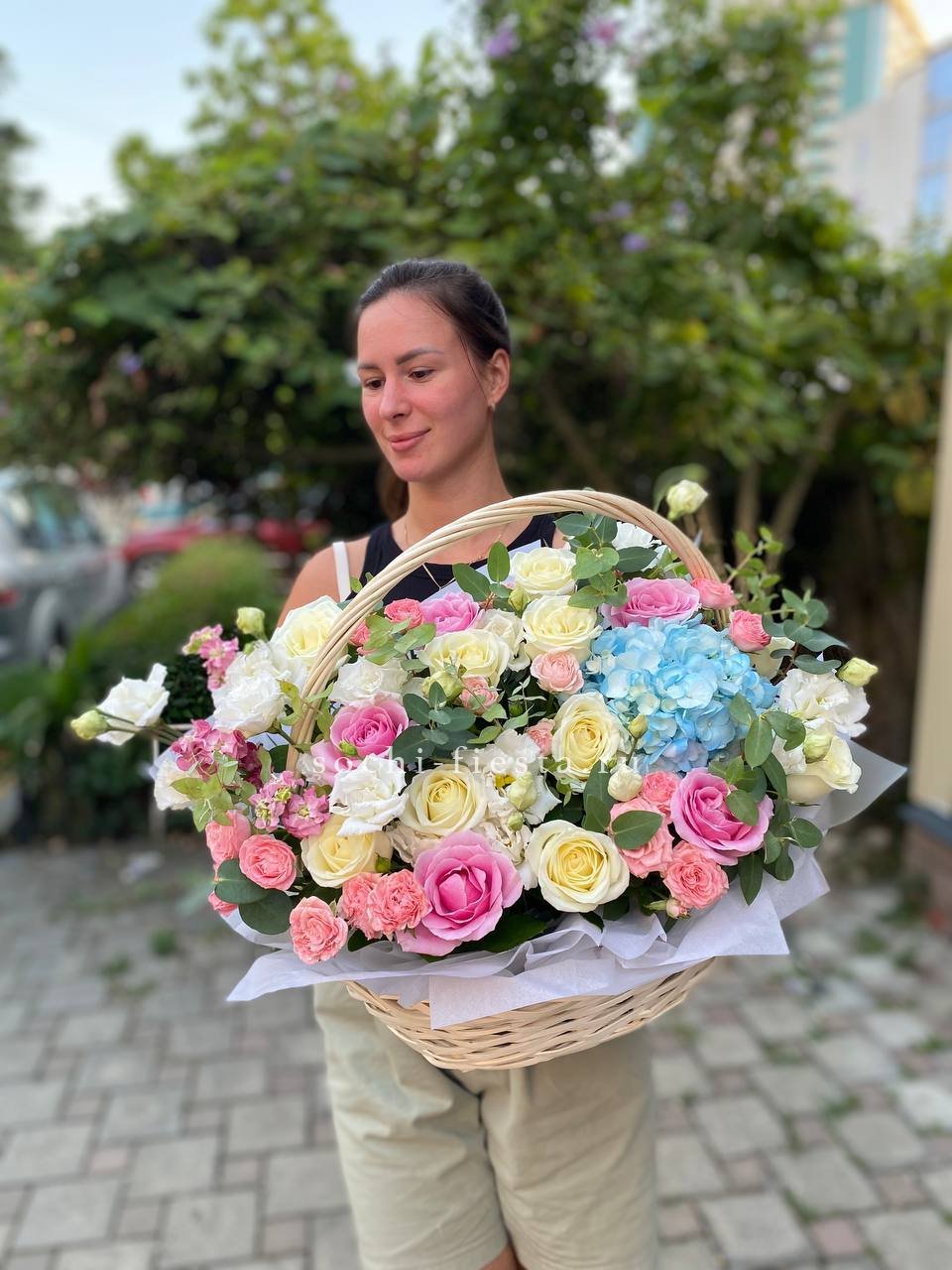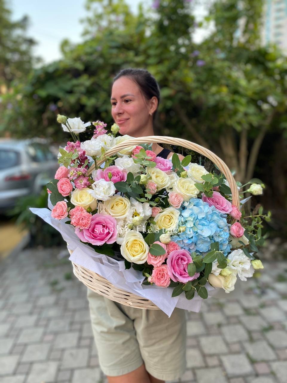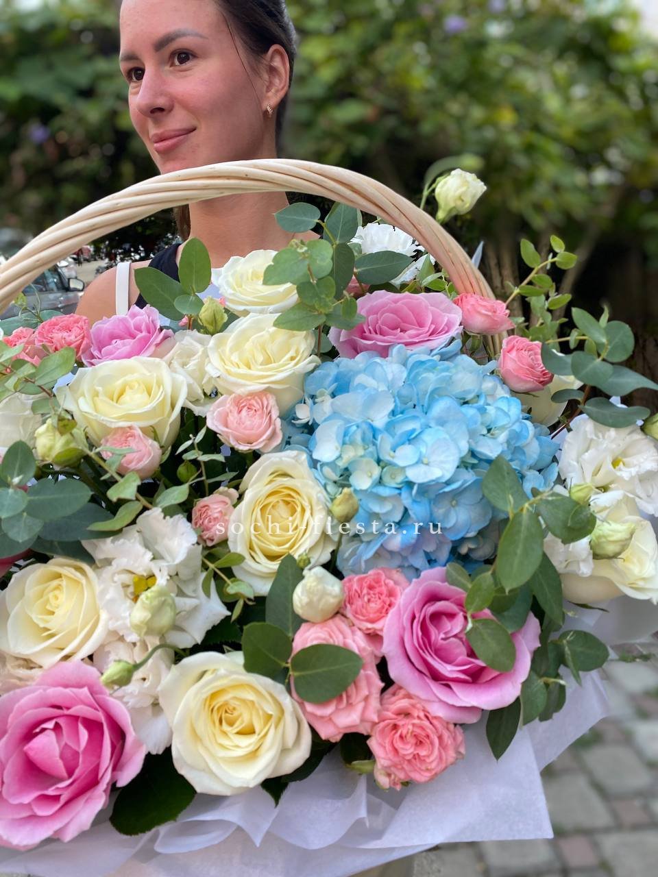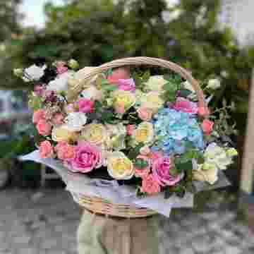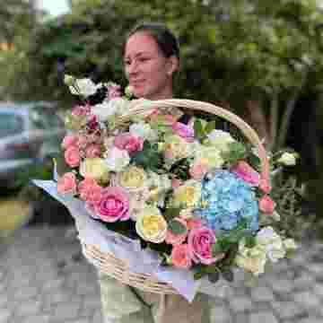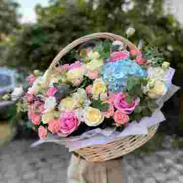 Состав: розы, эустома, гортензия, бомбастик, маттиола ( или аналог), эвкалипт, корзина