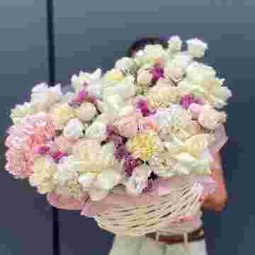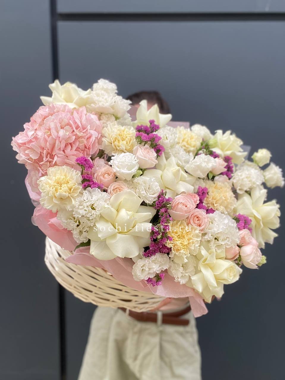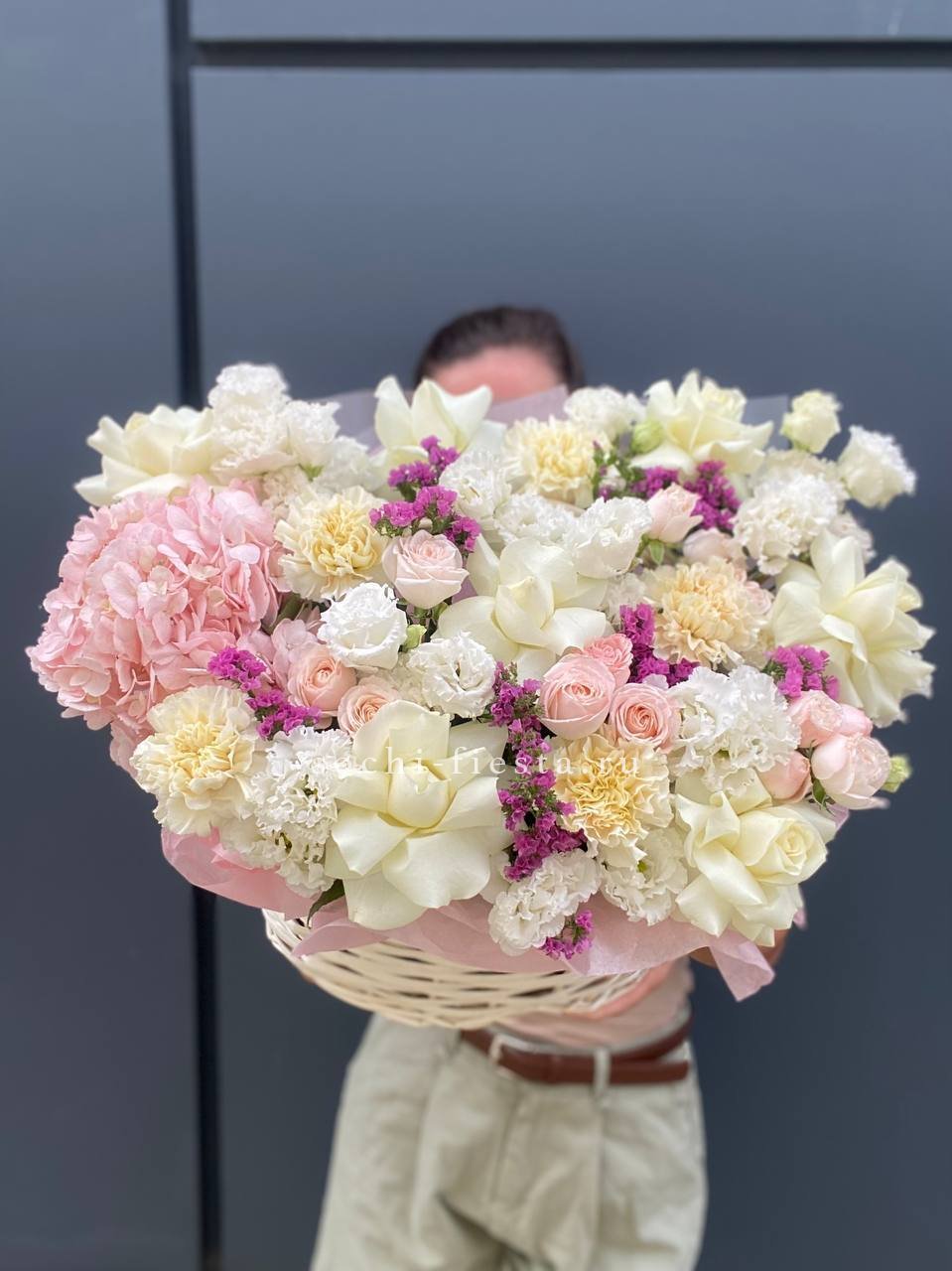 Состав: гортензия, эустома, диантус, роза, бомбастик, статица или аналог, корзина