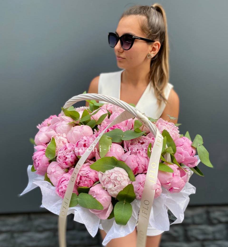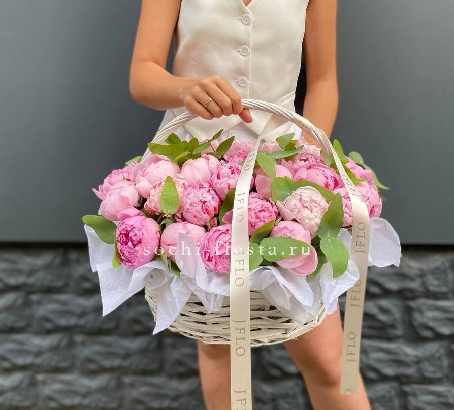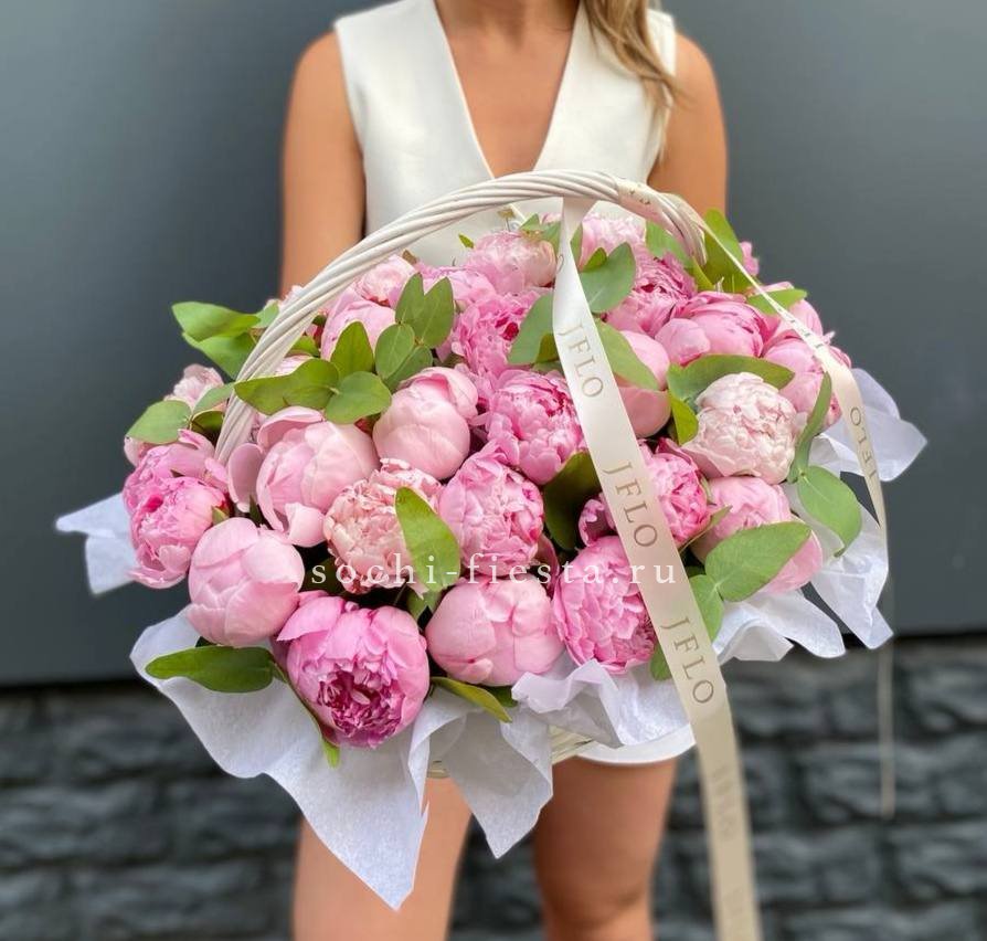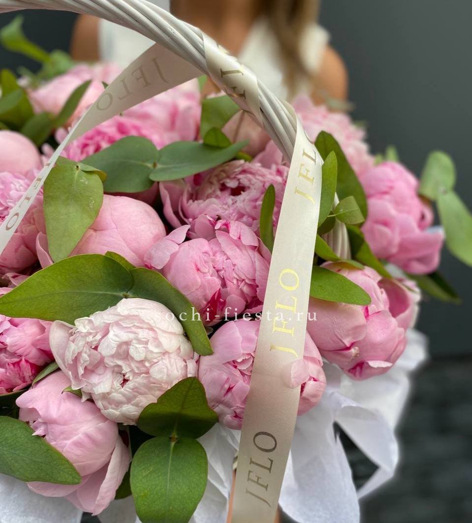 Состав: 29 пионов, эвкалипт, корзина, лента