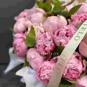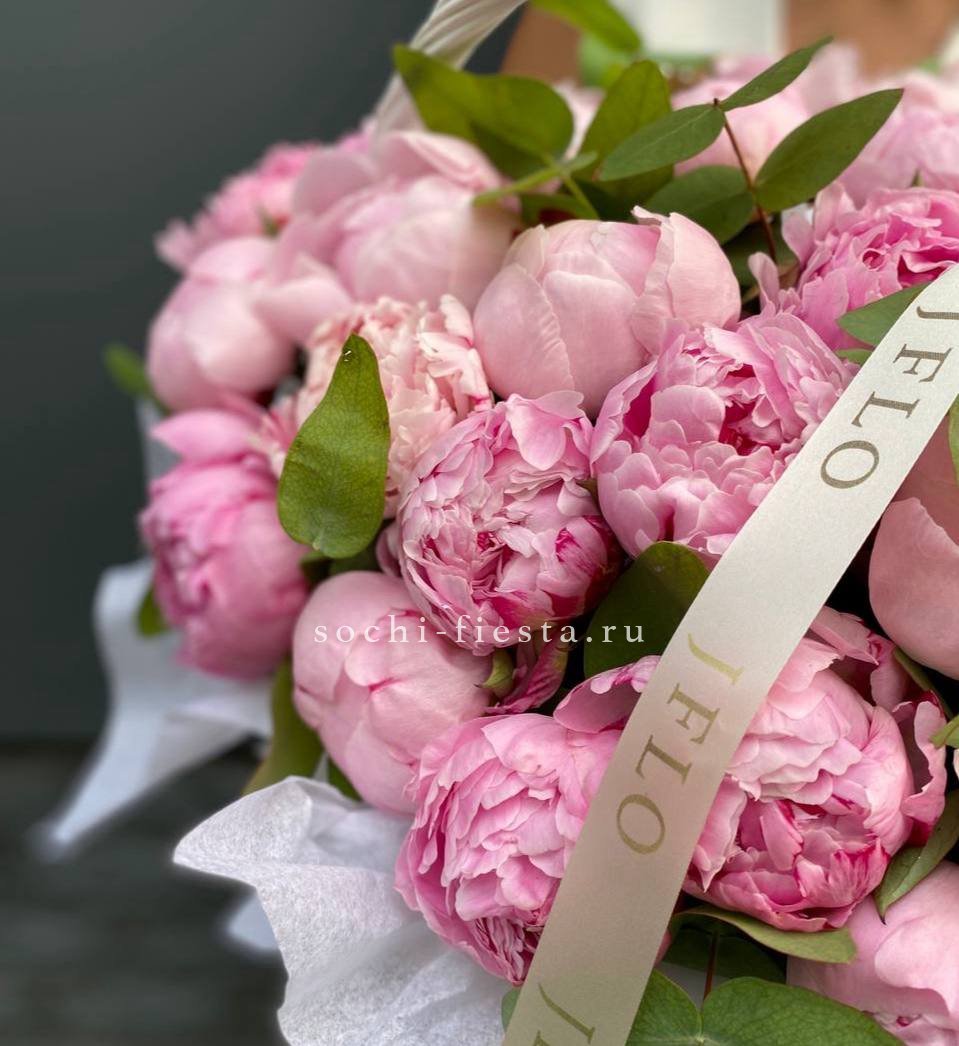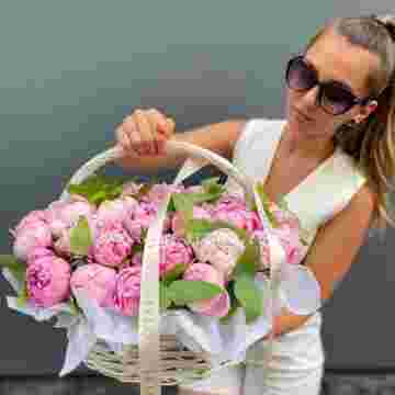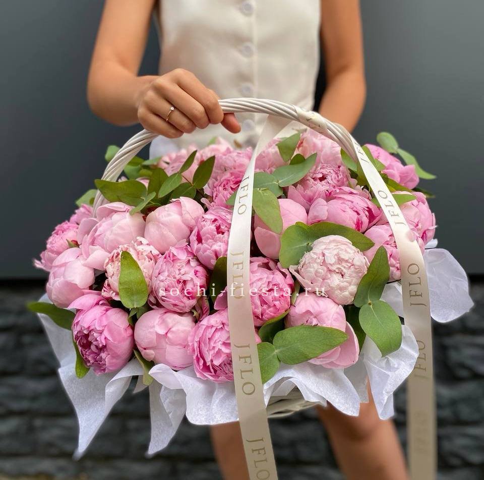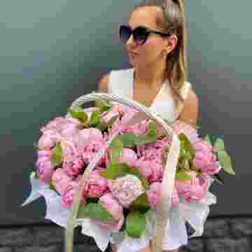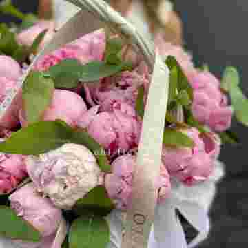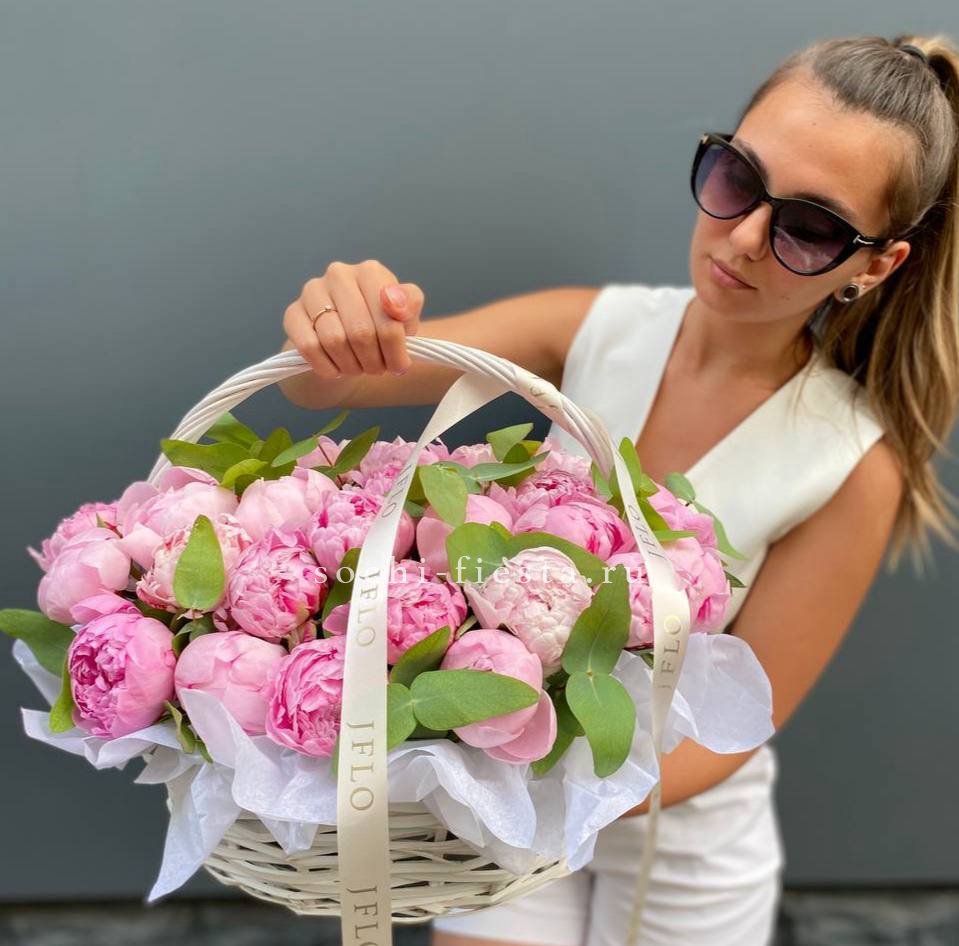 Состав: 29 пионов, эвкалипт, корзина, лента