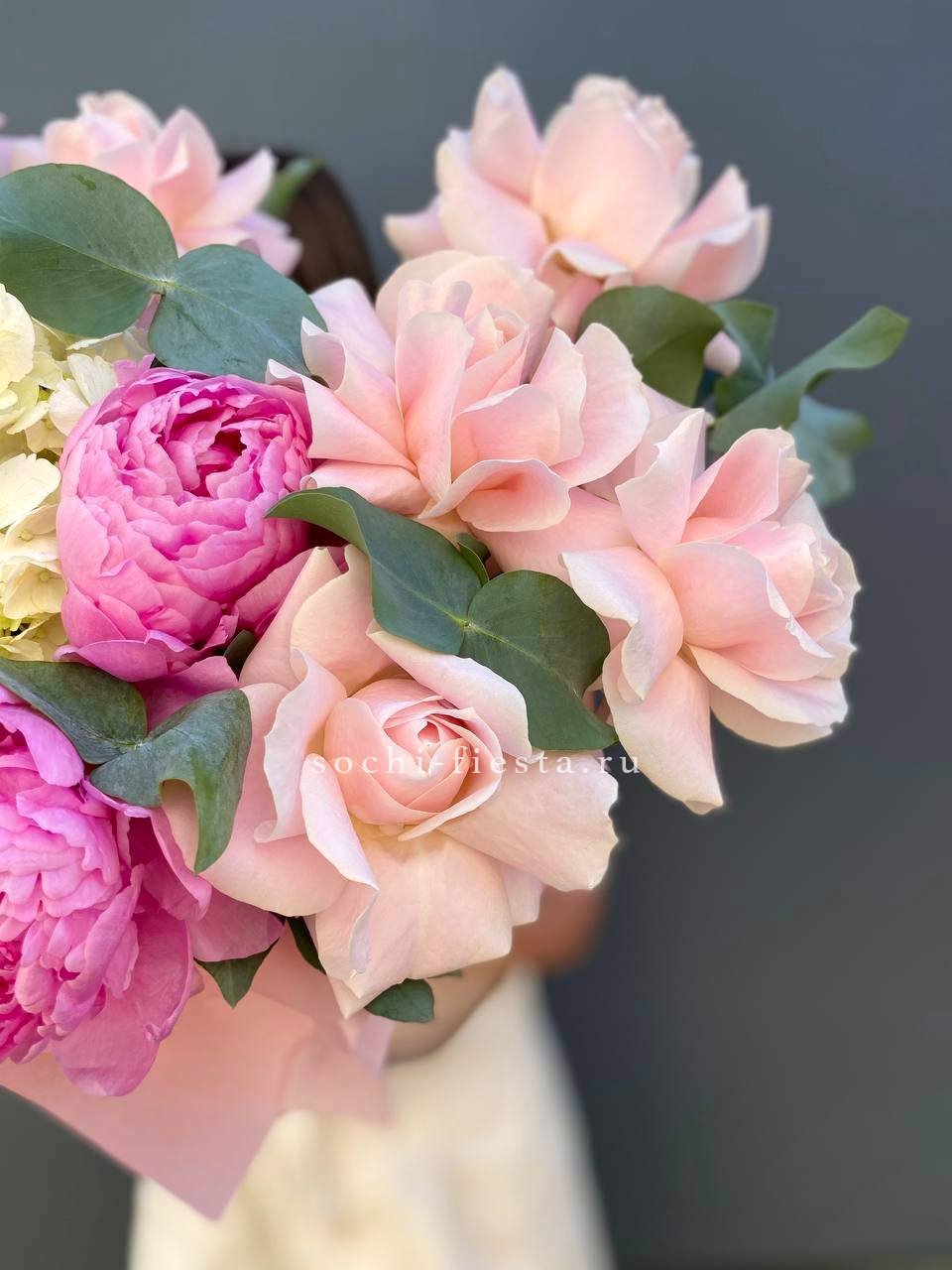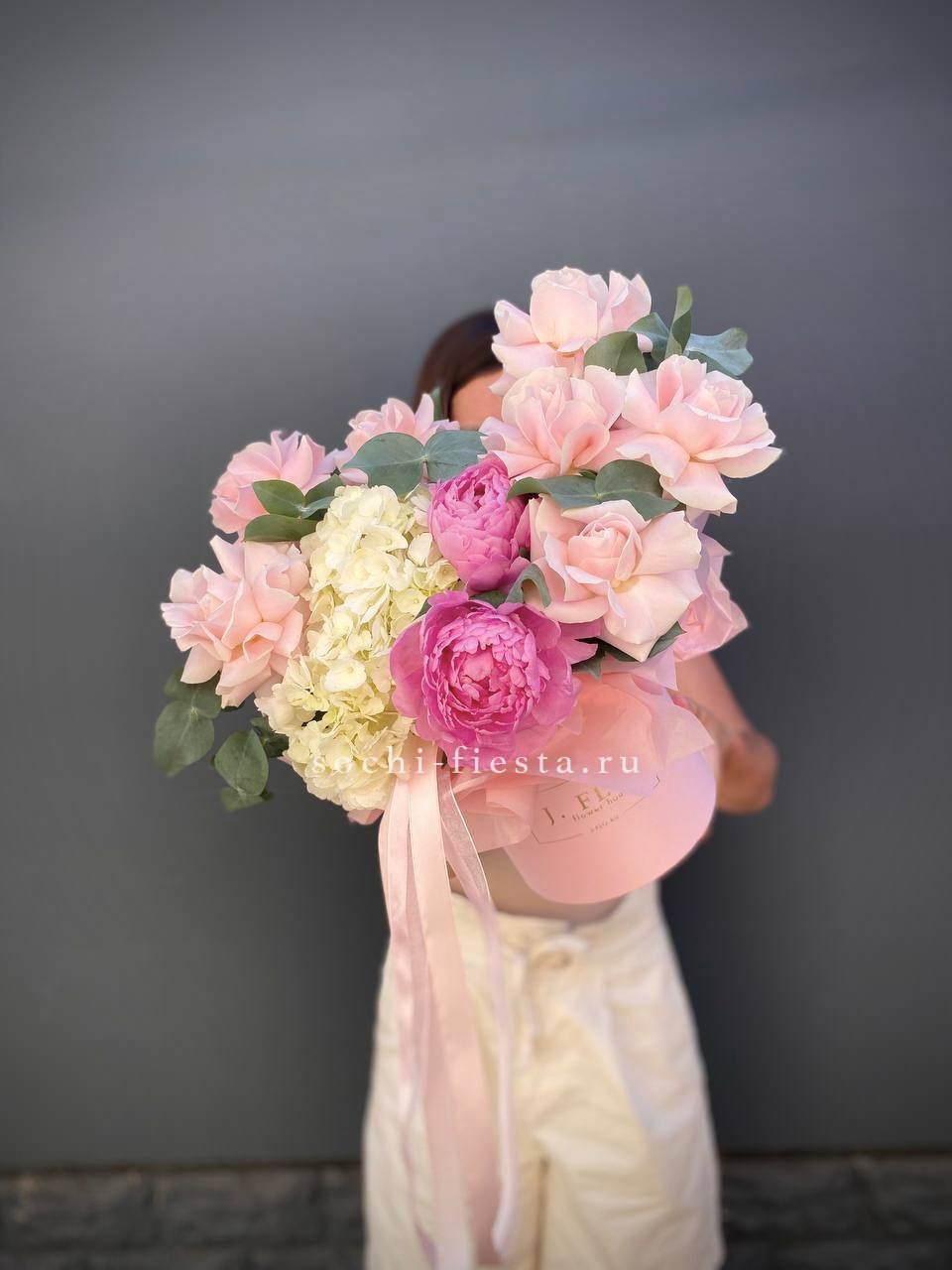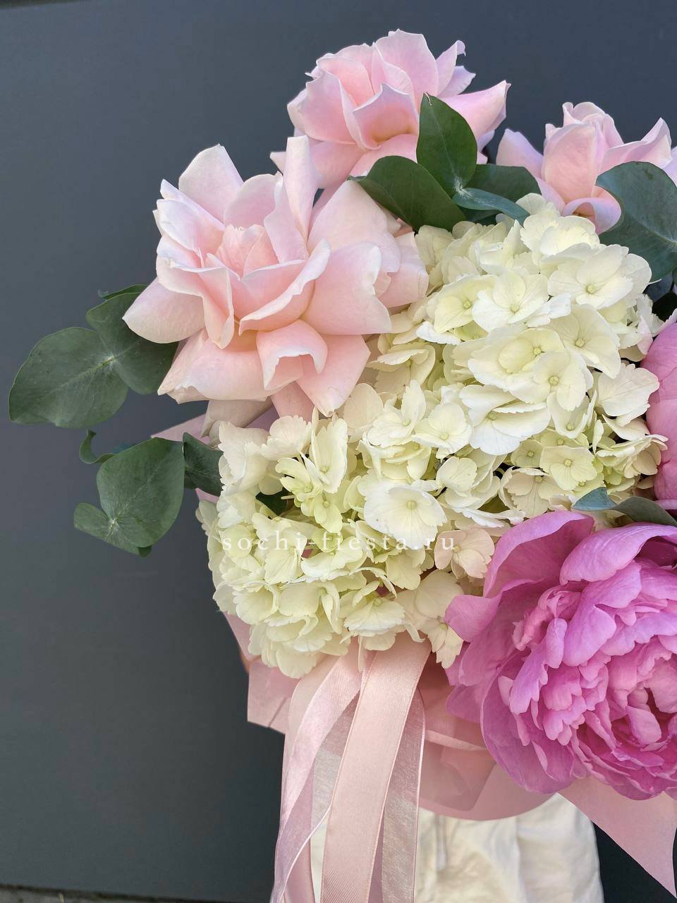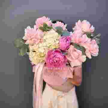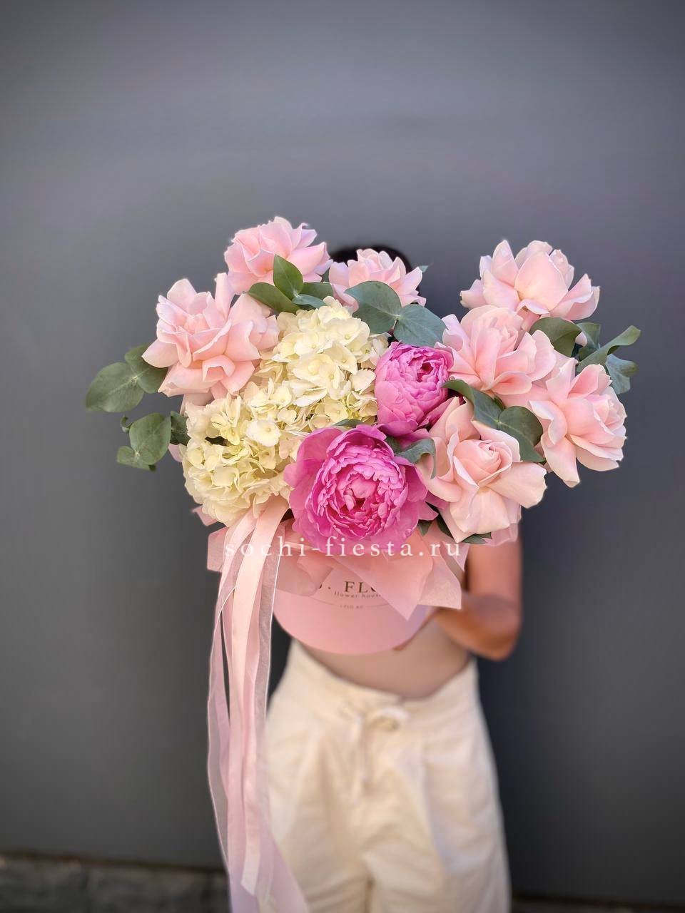 Состав: гортензии, пионы, розы, лилии,  лента, цилиндр D16.