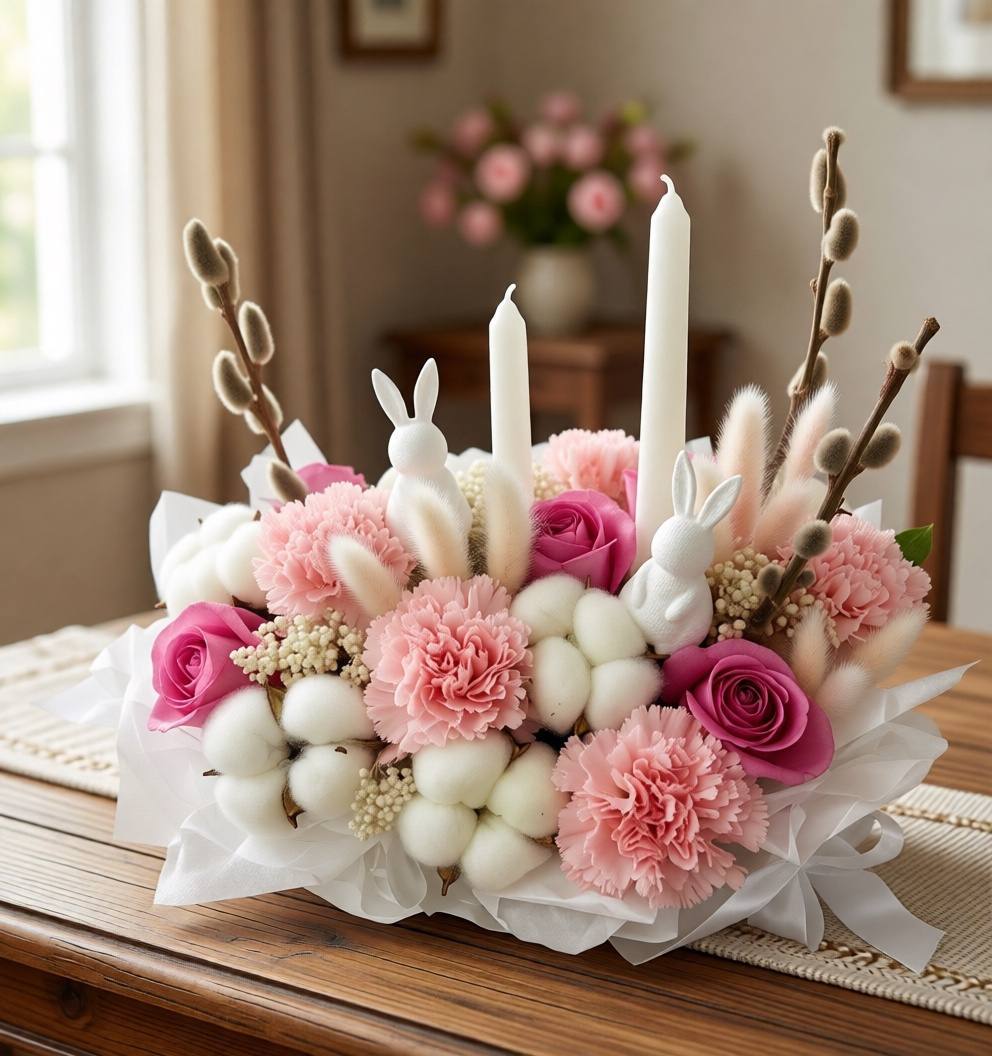 розы, диатусы, сухоцветы, свечи и зайцы.