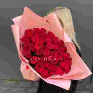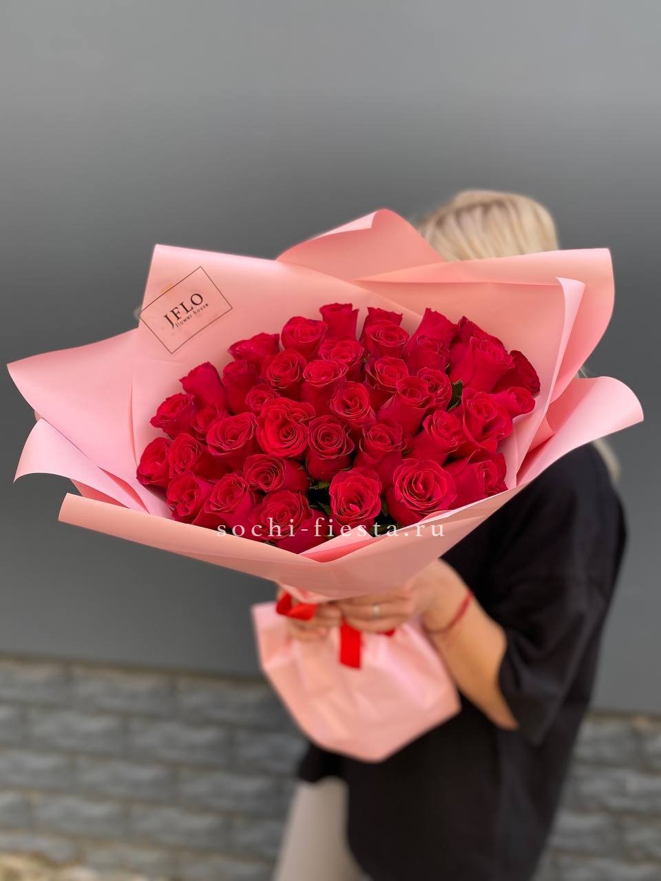 Состав: 35 красных роз, лента, дизайнерская пленка