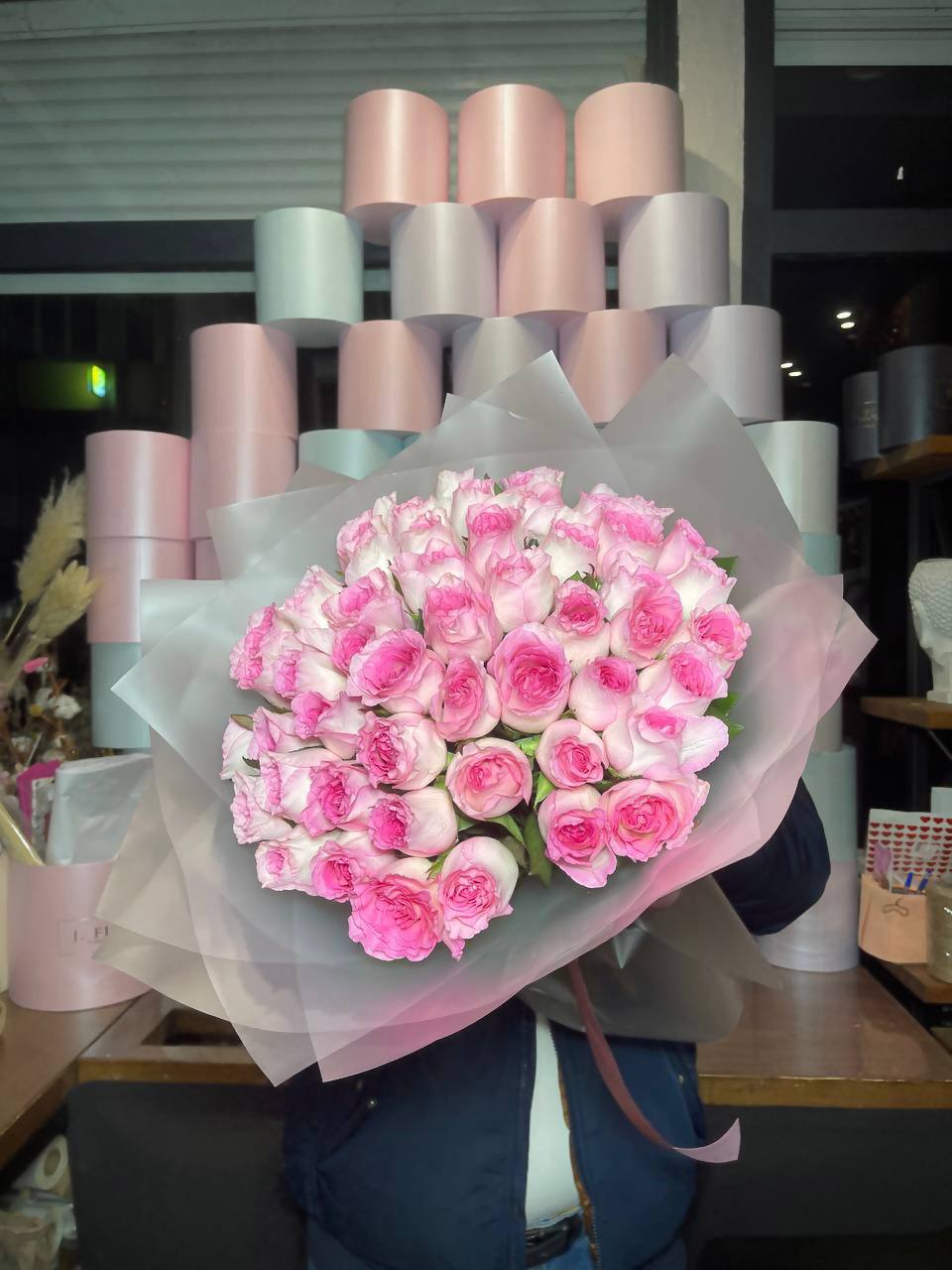 Пятьдесят одна роза собрана в плотный монохромный букет, где каждый бутон создаёт общий объём и глубину. Розовый оттенок раскрывается по-разному в зависимости от света и угла обзора. Композиция впечатляет масштабом и цельностью формы.
